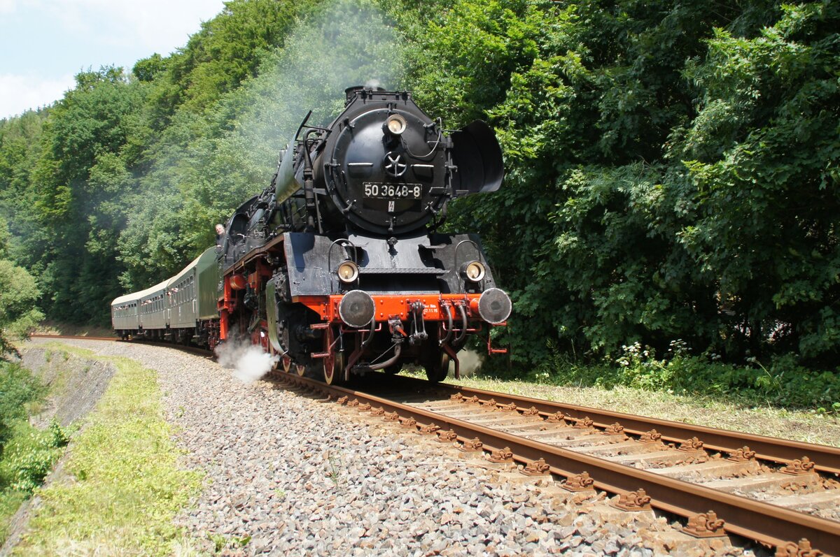 Flöhatal kurz vor Lengefeld-Rauenstein; Chemnitzer Museumszug mit 50 3648-8 auf dem Weg nach Pockau-Lengefeld am 03.07.2021 gegen 14 Uhr