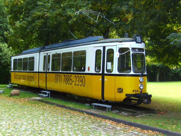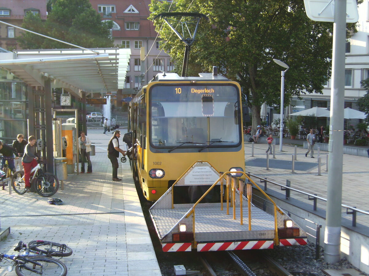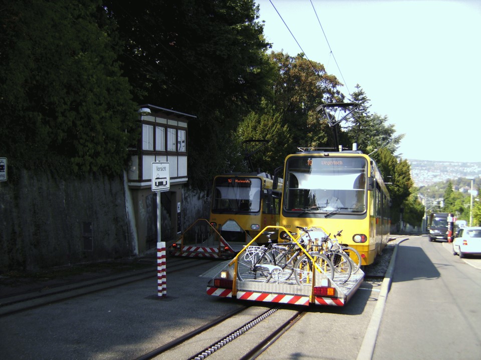 Zahnradbahn Stuttgart Wagen 1002 mit Fahrradvorstellwagen 1981 nach seiner Ankunft an der Endhaltestelle Marienplatz.