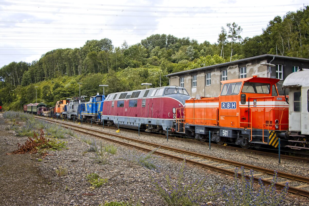 Am verregneten 30.06.2021 rangiert die Lok  Münster  der Borkumer Kleinbahn vor dem Depot