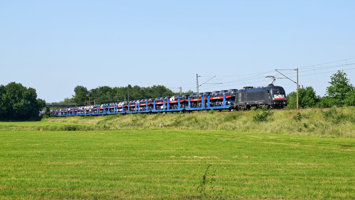 MRCE ES 64 U2-011 (182 511), vermietet an Steiermarkbahn, mit Milsped-AML-Autotransportzug in Richtung Osnabrück (Hüde, 17.06.2021).