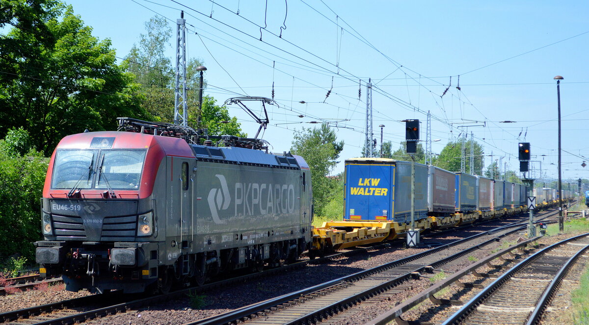 PKP CARGO S.A., Warszawa [PL] mit der  EU46-518  [NVR-Nummer: 91 51 5370 031-4 PL-PKPC] und Containerzug am 03.06.21 Durchfahrt Bf. Saarmund.