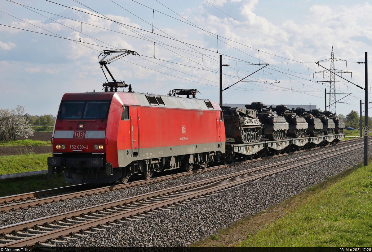 [Reupload] Y-Tours rollt wieder durchs Land. Mit sechs Panzern auf bundeswehreigenen Flachwagen fährt 152 030-3 (Siemens ES64F) an der Blockstelle (Bk) Braschwitz Richtung Köthen vorbei. 🧰 DB Cargo 🚩 Bahnstrecke Magdeburg–Leipzig (KBS 340) 🕓 3.5.2021 | 17:28 Uhr