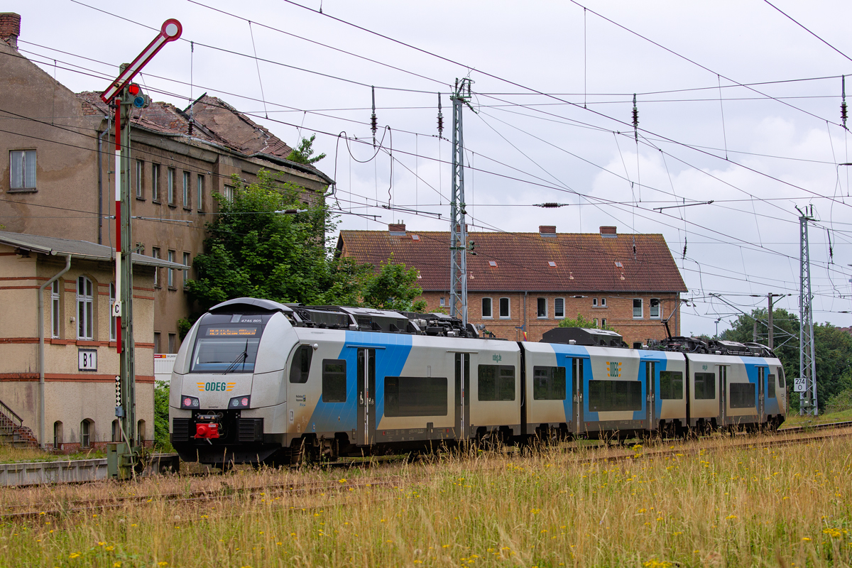 Am 06.07.2021 wurde der ODEG-KISS-Triebzug ET 445.113 bei der Stadler Service GmbH in Berlin-Reinickendorf auf dem öffentlich zugänglichen Industriegelände angeliefert. Der Zug besteht aus folgenden Wagen: Wagen 94 80 0445 113-4 D-ODEG, Wagen 94 80 0445 613-3 D-ODEG, Wagen 94 80 0446 113-3 D-ODEG und Wagen 94 80 0446 613-2 D-ODEG. Auf dem Foto schiebt das Zagron XL Rangiergerät den Triebzug in die Werkhalle.