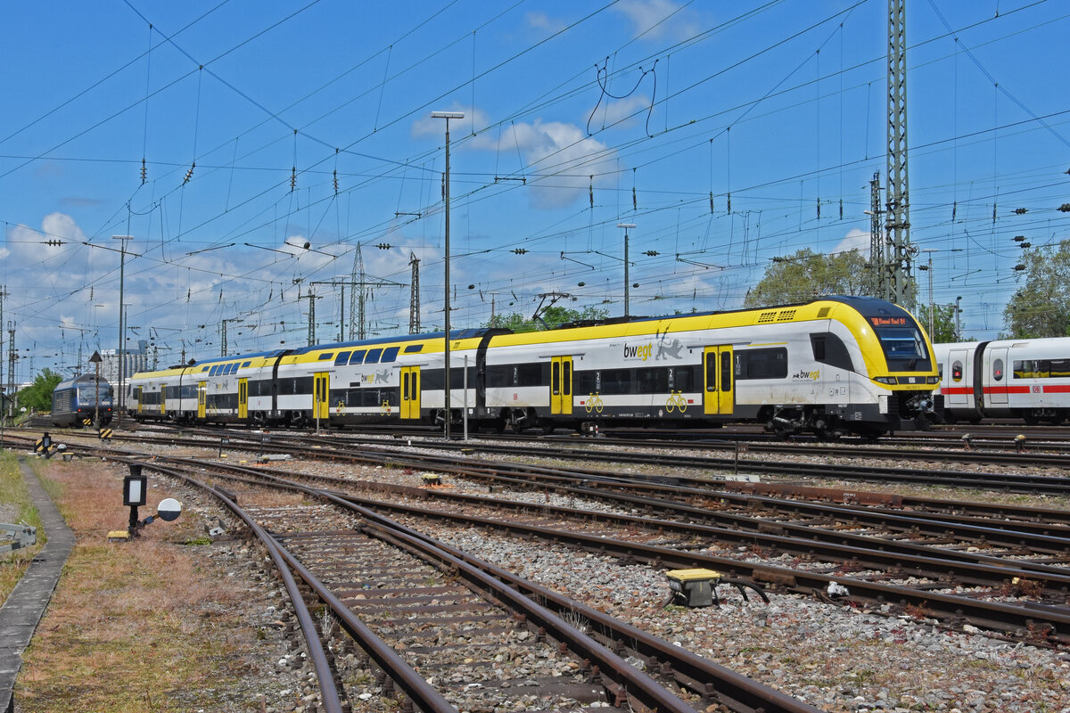 Nach dem abliefern der GTW verlässt die Doppeltraktion, mit dem A 50 85 10-95 013-4, dem B 50 85 21-95 277-2 und dem B 50 85 21-95 056-0 den Bahnhof Kaiseraugst. Die Aufnahme stammt vom 05.07.2021.