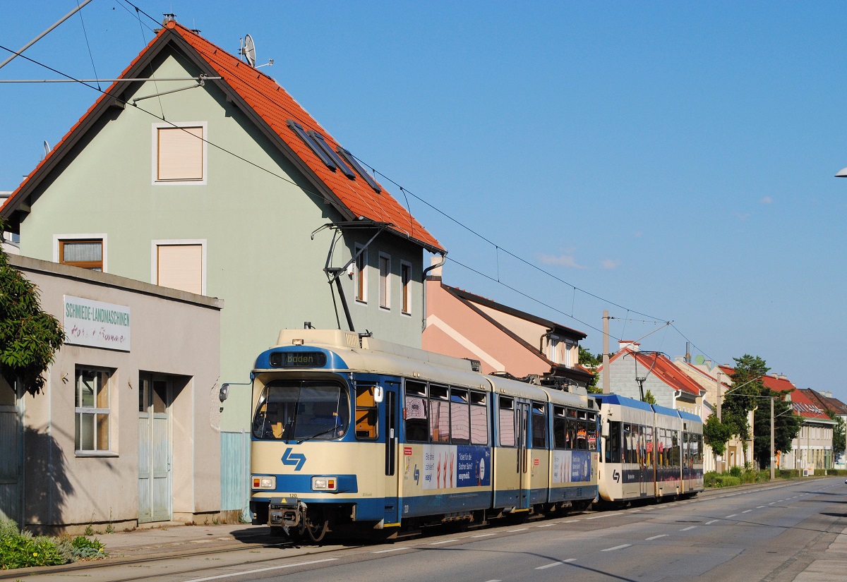 Tw.410 + 112 in Baden am Kaiser Franz Joseph Ring kurz vor der Endstelle Josephsplatz, die Zielanzeige wurde bereits für die Rückfahrt nach Wien eingestellt. (03.07.2021)