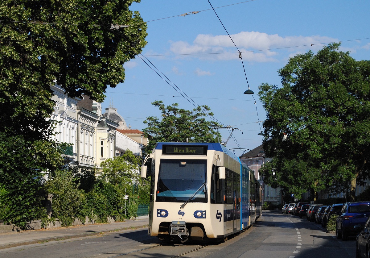 Bei tiefstehender Abendsonne überquert das aus den Tw.408 + 101 bestehende Tandem auf dem Kaiser Franz Joseph Ring die Kreuzung Wassergasse und wird in wenigen Metern die Endstelle Josephsplatz erreichen. (03.07.2021)