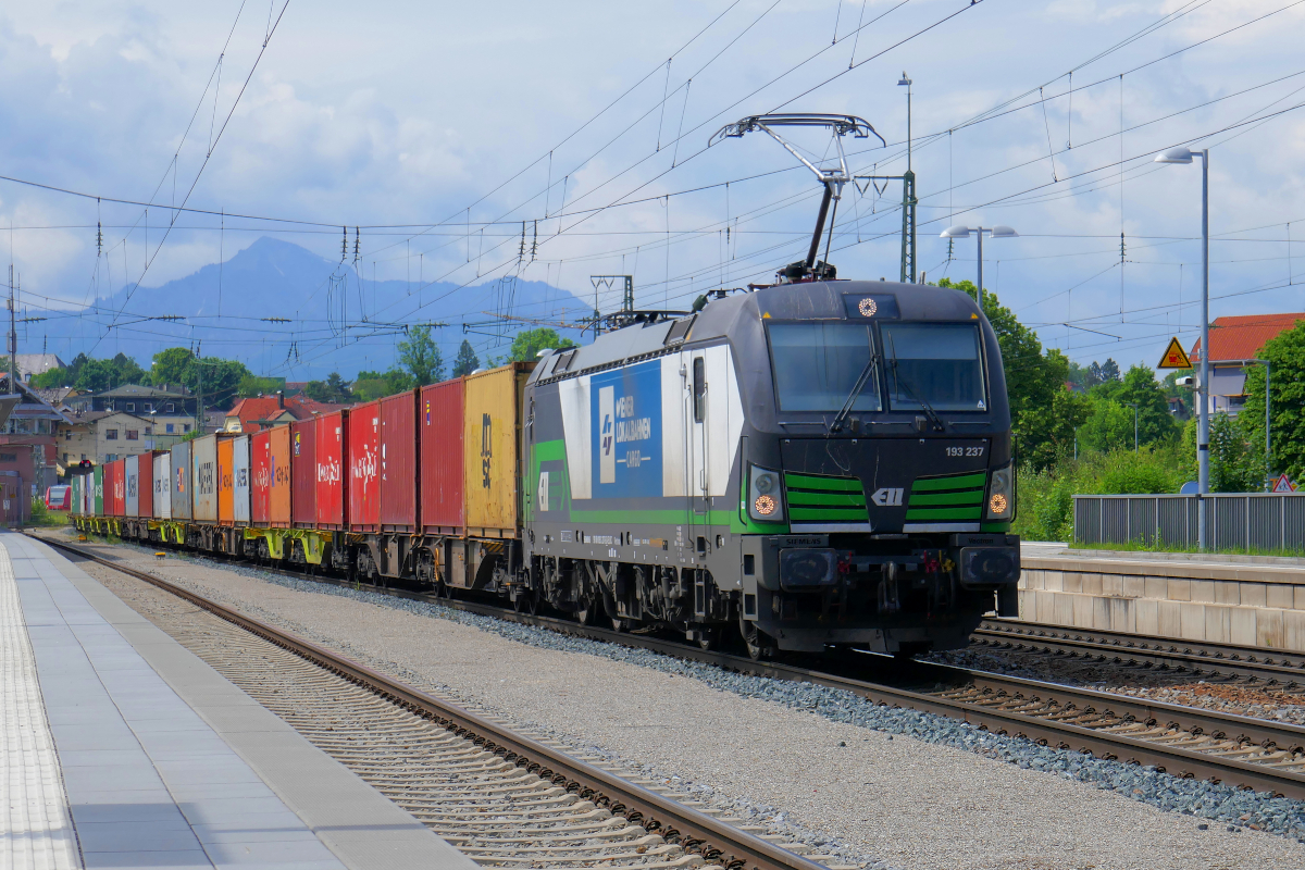 ÖBB Vectron 1293 174 hat 10 Rocktainer aus dem Ankunftsgleis im Bahnhof Rohrdorf gezogen, um sie in das Anschlußgleis des Zementwerks zu schieben. Alle Rangiermanöver werden in sehr kurzer Zeit abgewickelt. Zwischen der Ankunft des Zuges und dem Zustellen der ersten 10 Waggons vergeht nur etwa eine viertel Stunde. 6. Juli 2021