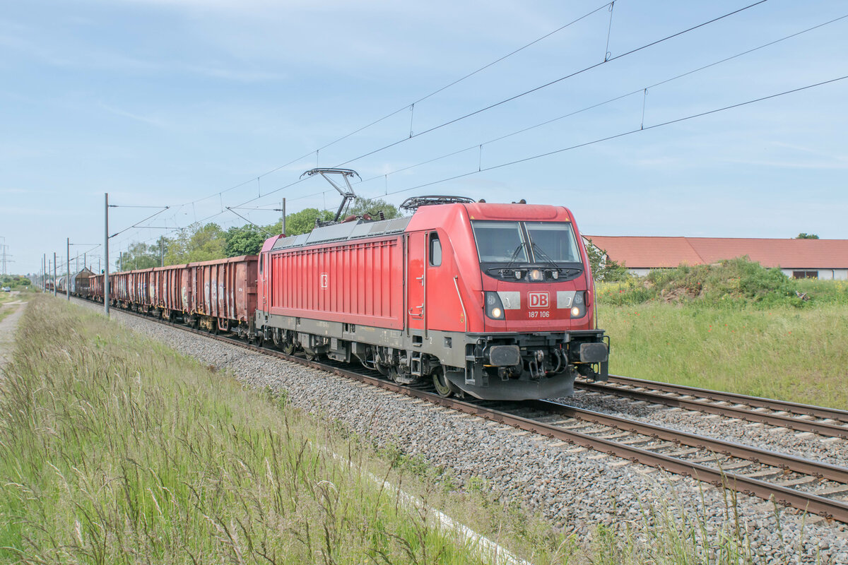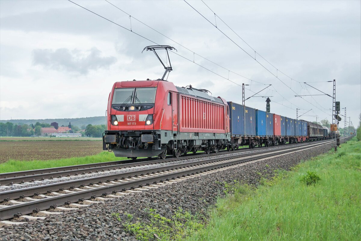 187 173-0 unterwegs mit einen gemischten Güterzug am 18.05.2021 bei Friedland.
