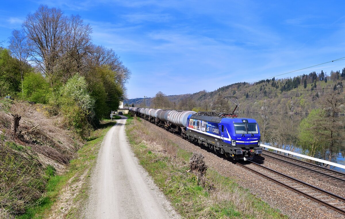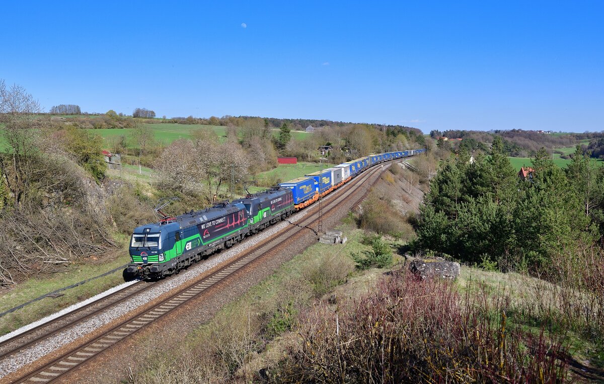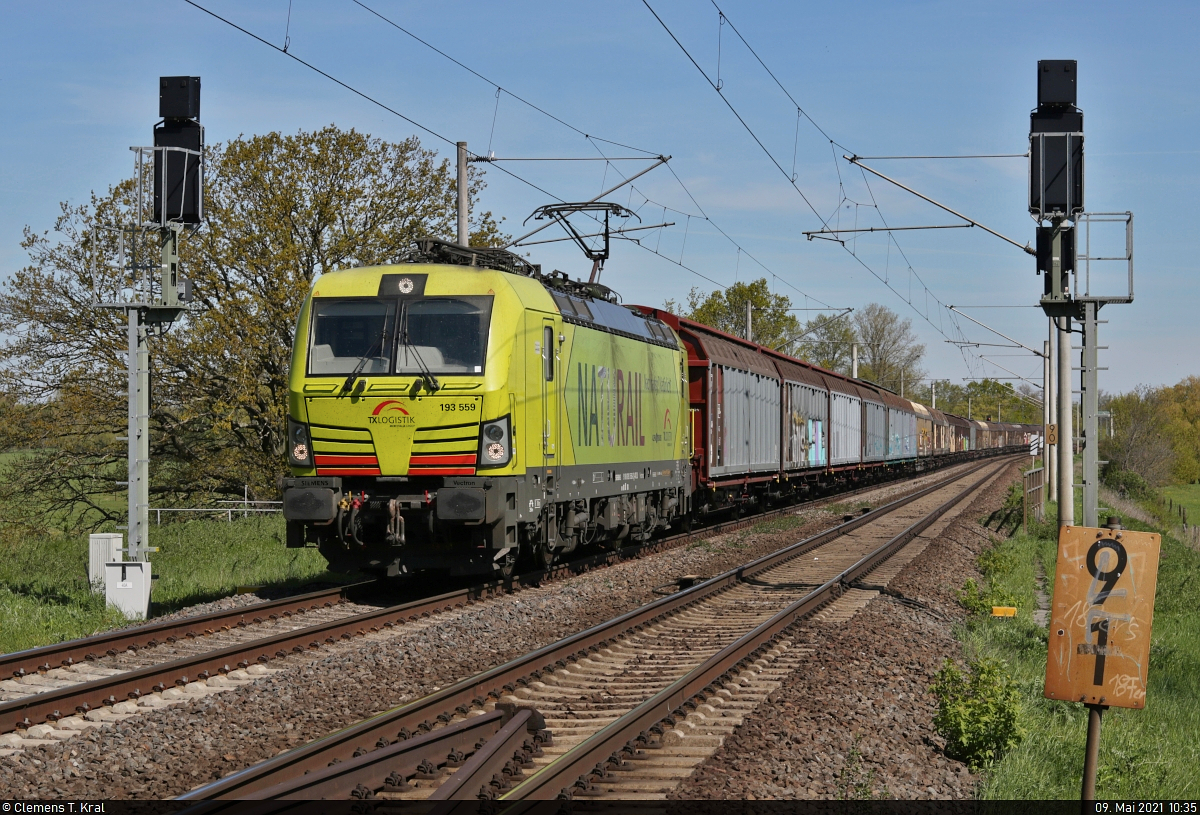 [Reupload] Papierzug mit 193 559-2 "Naturail" (Siemens Vectron) muss Richtung Merseburg Hbf an der Saalebrücke in Schkopau wegen einer vorausfahrenden RB in die Eisen gehen. Aufgenommen vom Saaleradweg, der über die Brücke führt (siehe Geodaten). 🧰 Alpha Trains Luxembourg S.à r.l., vermietet an die TX Logistik AG (TXL) 🚩 Bahnstrecke Halle–Bebra (KBS 580) 🕓 9.5.2021 | 10:35 Uhr
