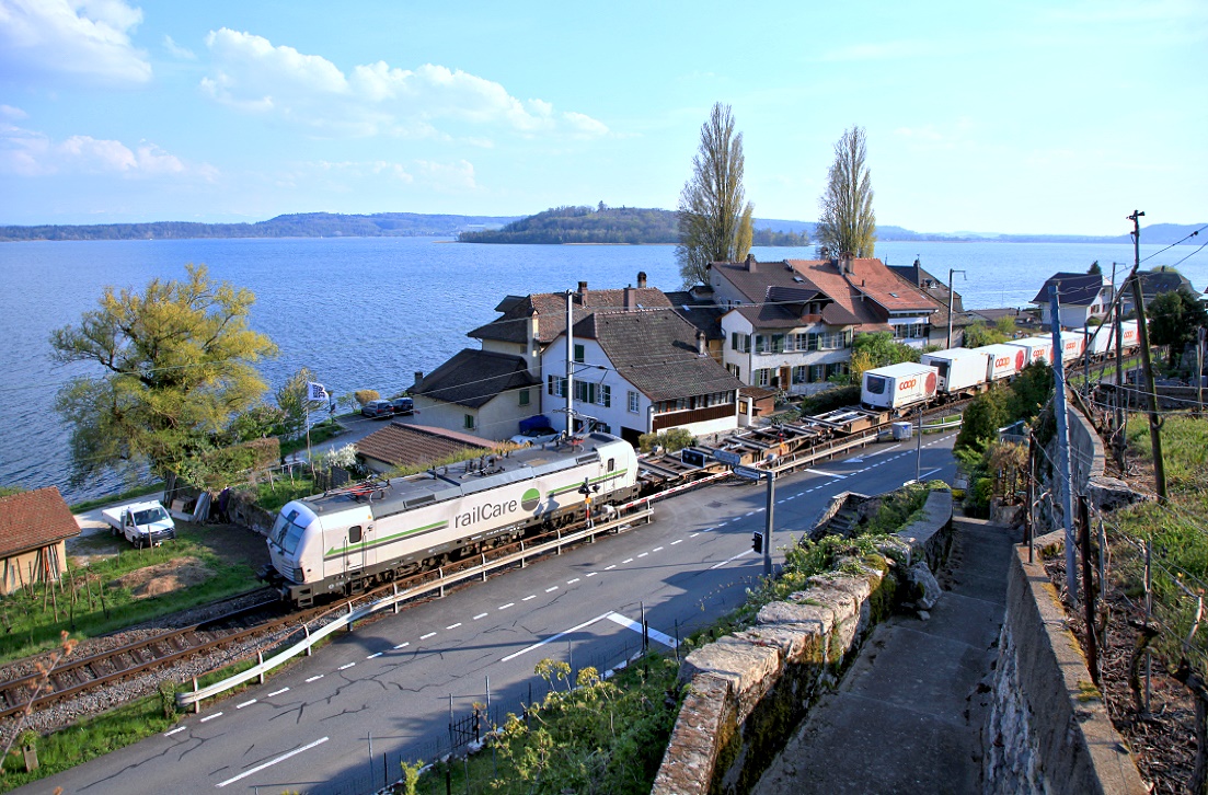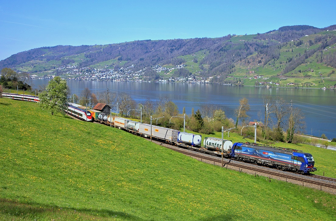 Am 20.05.2021 ist eine Re 10 bestehend aus SBB Cargo Re 620 017-4 und Re 420 332-9 unterwegs mit einem internationalen Güterzug von Gallarate nach Ludwigshafen und konnte hier bei Einigen am Thunersee aufgenommen werden.
