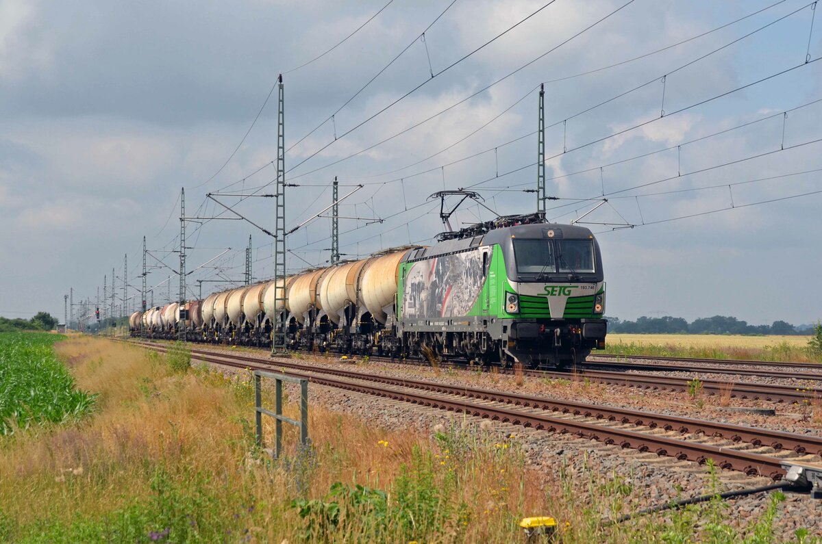 193 746 der SETG rollte am 02.07.21 mit dem Knickkesselwagenzug nach Schwedt(O) durch Radis Richtung Wittenberg.