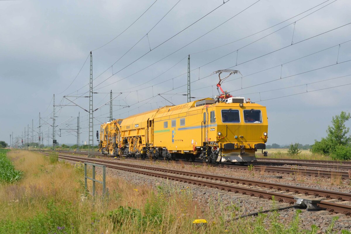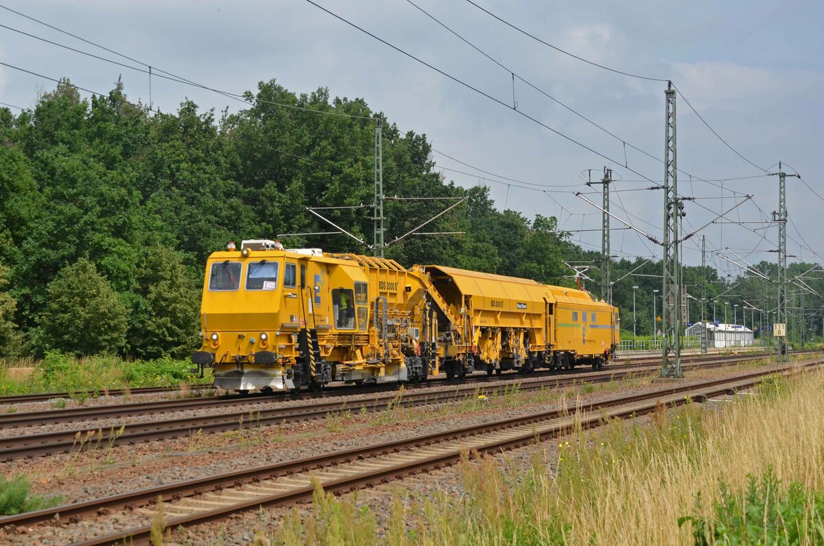 Die Baumaschine zur Schotterverteilung und Planierung vom Typ BDS 2000 E3 von Plasser & Theurer rollte am 02.07.21 durch Radis Richtung Bitterfeld.Da sie an diesem Tag insgesamt acht mal vorbei kam ist von einer Erprobungsfahrt auszugehen.