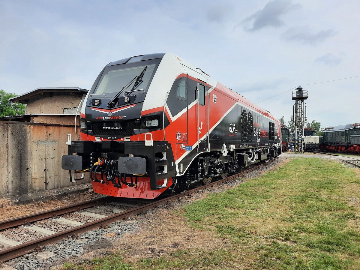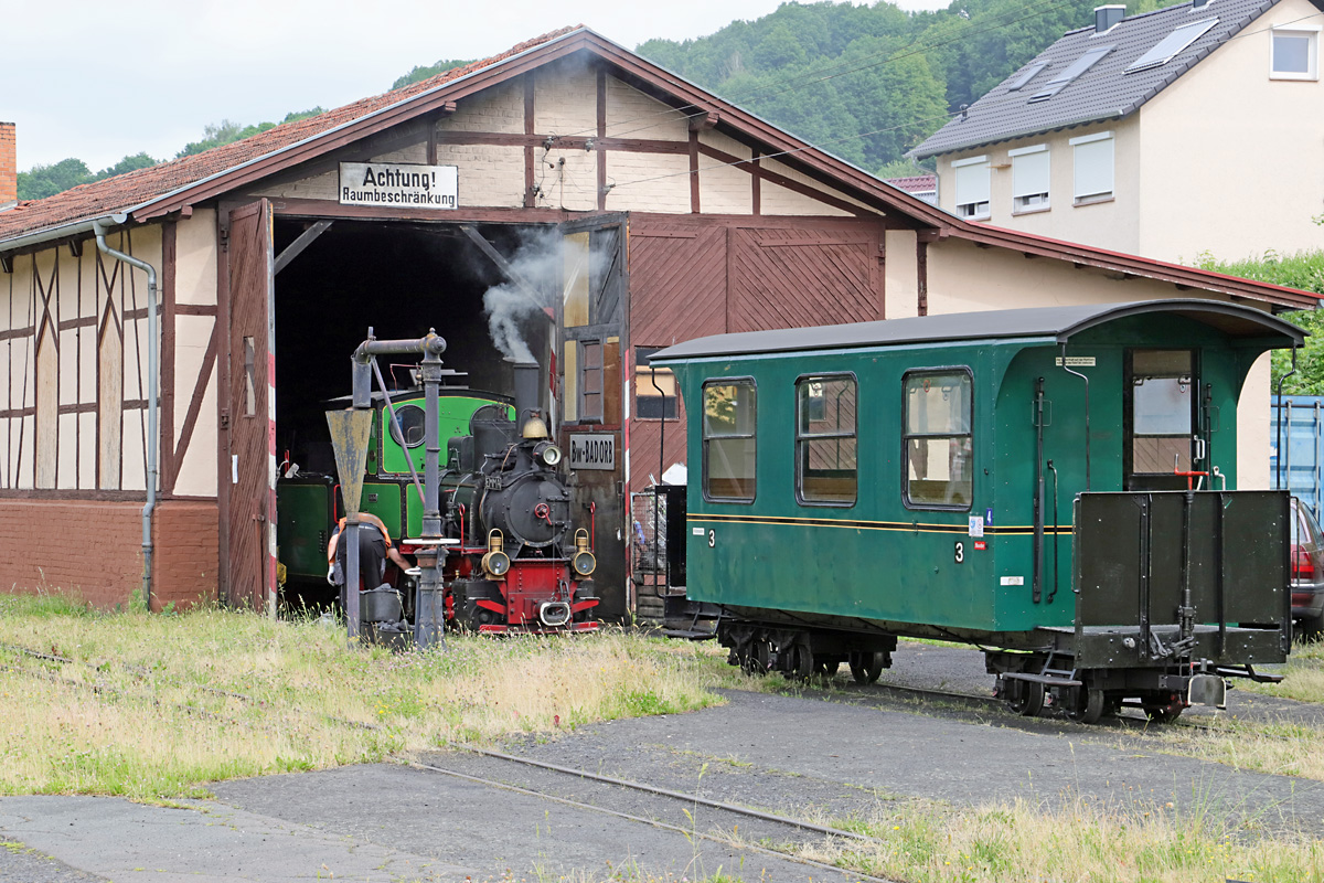 Die 30 PS starke Ns 2 f, eine in den 50er Jahren in Babelsberg gebaute Feldbahnlok, ist auf dem Bahnhof Bad Orb für den Rangierbetrieb zuständig. Nur in Ausnahmefällen muss sie auch im Fahrbetrieb aushelfen, das war am 20.06.2021 aber nicht notwendig, sie musste nur die 3 Personenwagen aus dem Lokschuppen an den Bahnsteig drücken und hatte dann bis zum Nachmittag Pause