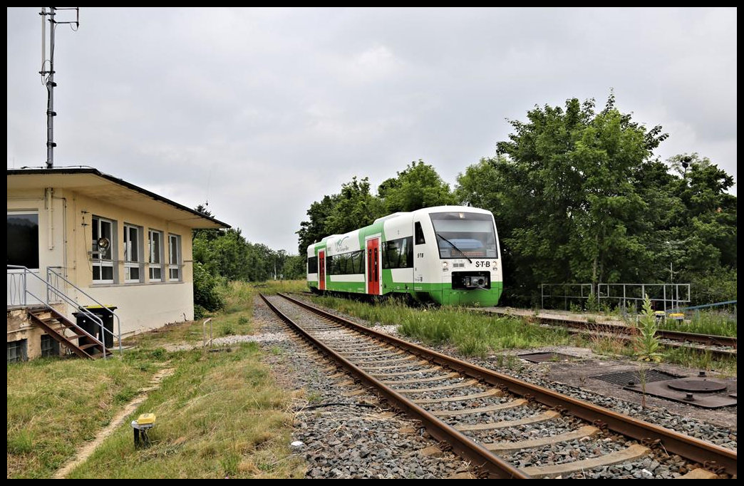 Aus Fröttstädt kommend erreicht hier der STB VT 128 am 25.6.2021 um 11.47 Uhr auf der Fahrt nach Friedrichsroda den Bahnhof Waltershausen.