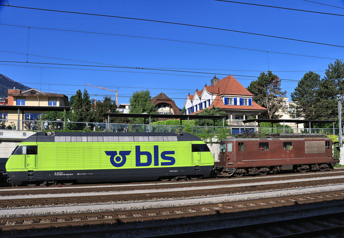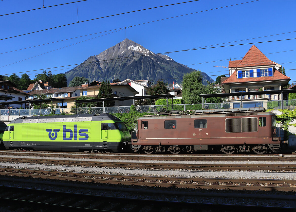 Die alte braune BLS Re 4/4 185 aus dem Jahr 1975 und die umfassend erneuerte BLS Re 465 018 von 1997. Spiez, am Fusse des Niesen, 14.Juni 2021