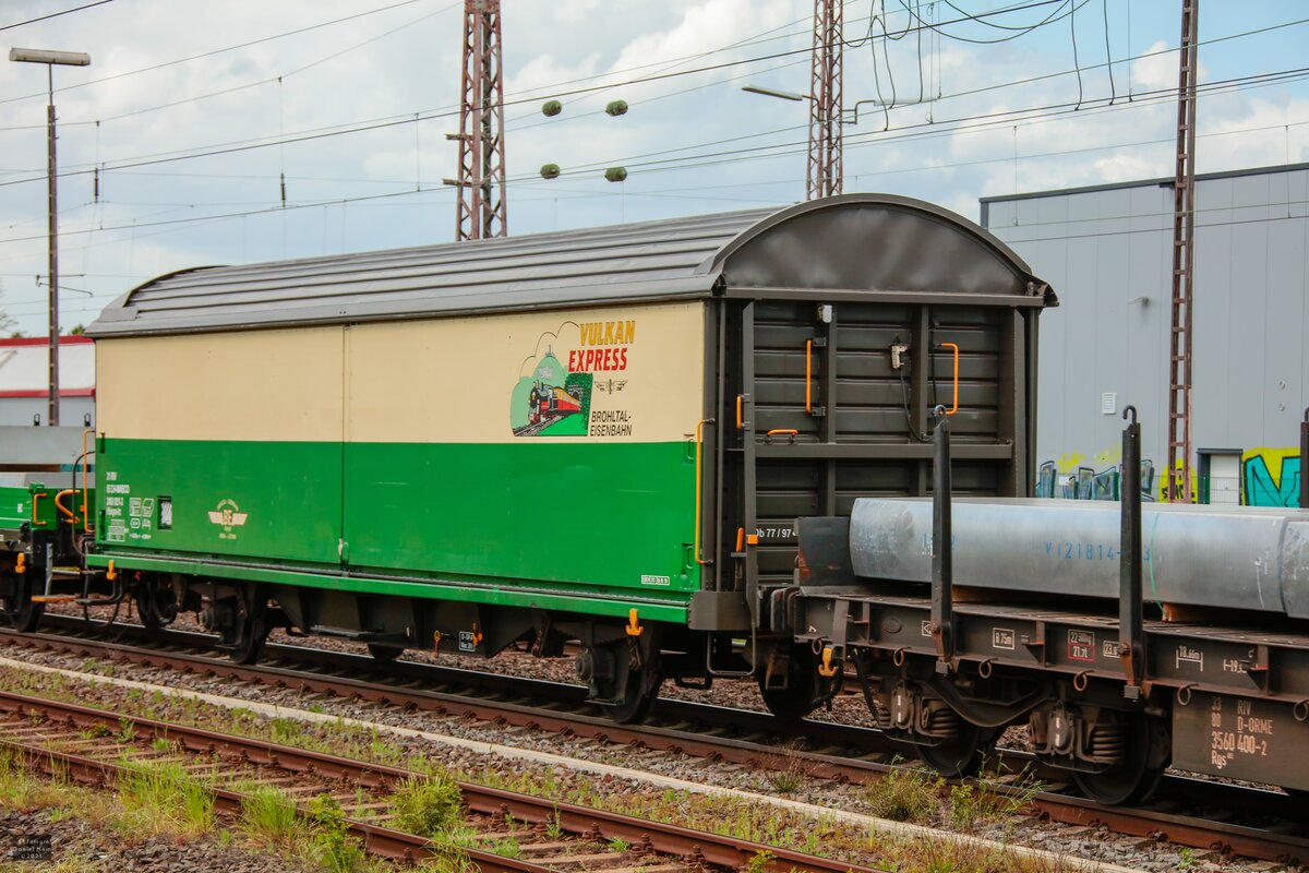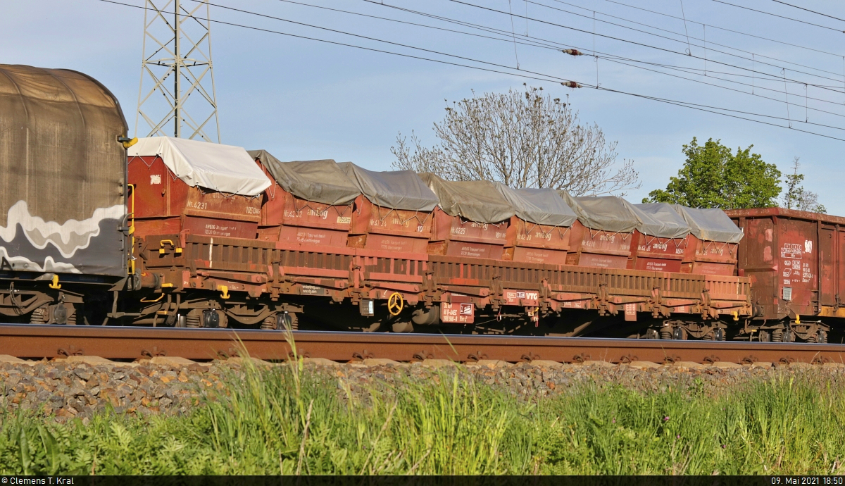 [Reupload] Blick auf einen vierachsigen Flachwagen mit Seitenborden der Gattung "Rens2" (35 68 3988 868-8 D-AAEC), beladen mit Absetzmulden der AWILOG-Transport GmbH aus Oberriexingen, der in einem gemischten Gz mit 152 007-1 (Siemens ES64F) an der Leipziger Chaussee (B 6) in Halle (Saale) Richtung Leipzig fährt. Nachtrag: Auf Hinweis von unserem Kategorien-Admin Frank hat der Wagen den Ländercode "68", also für Afghanistan. Laut Anschrift ist er aber in Deutschland beheimatet. Weiß darüber jemand zufällig mehr? 🧰 VTG AG 🚩 Bahnstrecke Magdeburg–Leipzig (KBS 340) 🕓 9.5.2021 | 18:50 Uhr