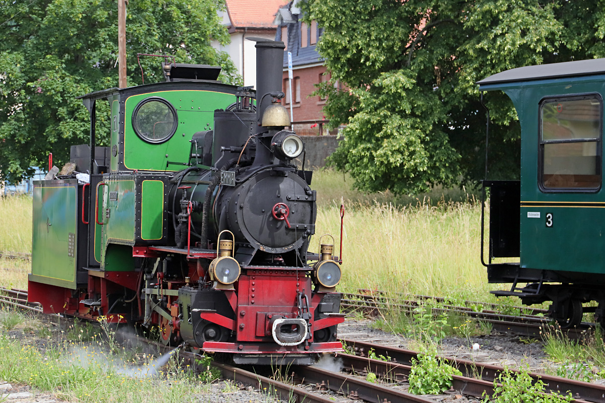 Die 1923 bei Hohenzollern gebaute Lok "Emma" rangiert am 20.06.2021 im Bahnhof Bad Orb an ihren aus 3 Wagen bestehenden Zug, den sie auf 600 mm Spur nach Wächtersbach bringen wird, dafür sind die 55 PS auch gut ausreichend. Nur in Ausnahmefällen (Defekt der Dampflok oder hohe Waldbrandwarnstufe) muss eine kleine Feldbahn-Diesellok einspringen.