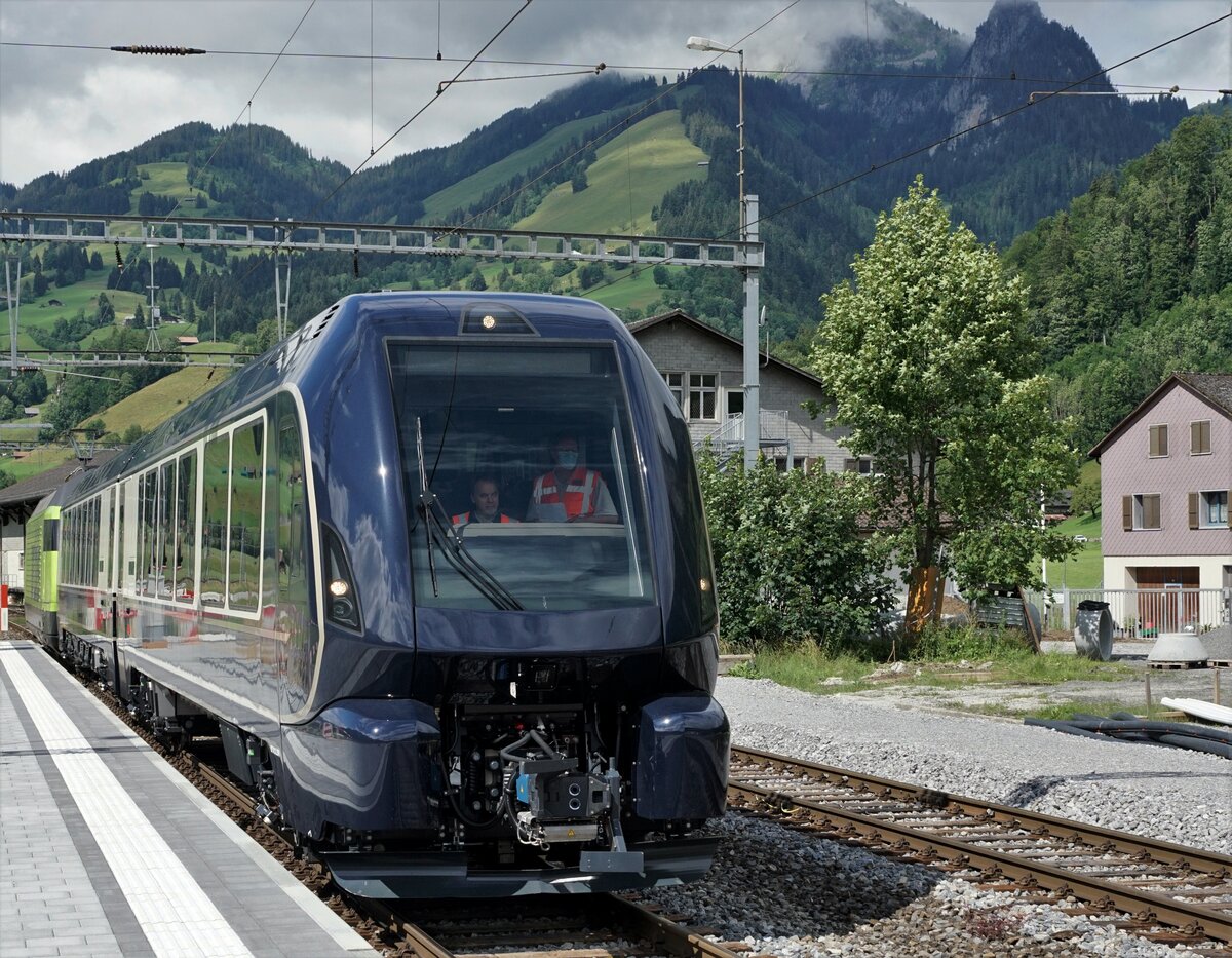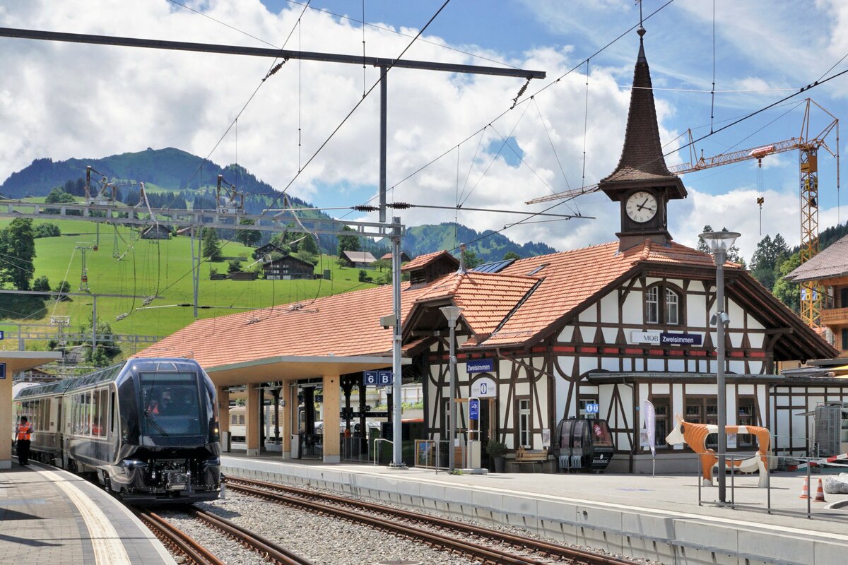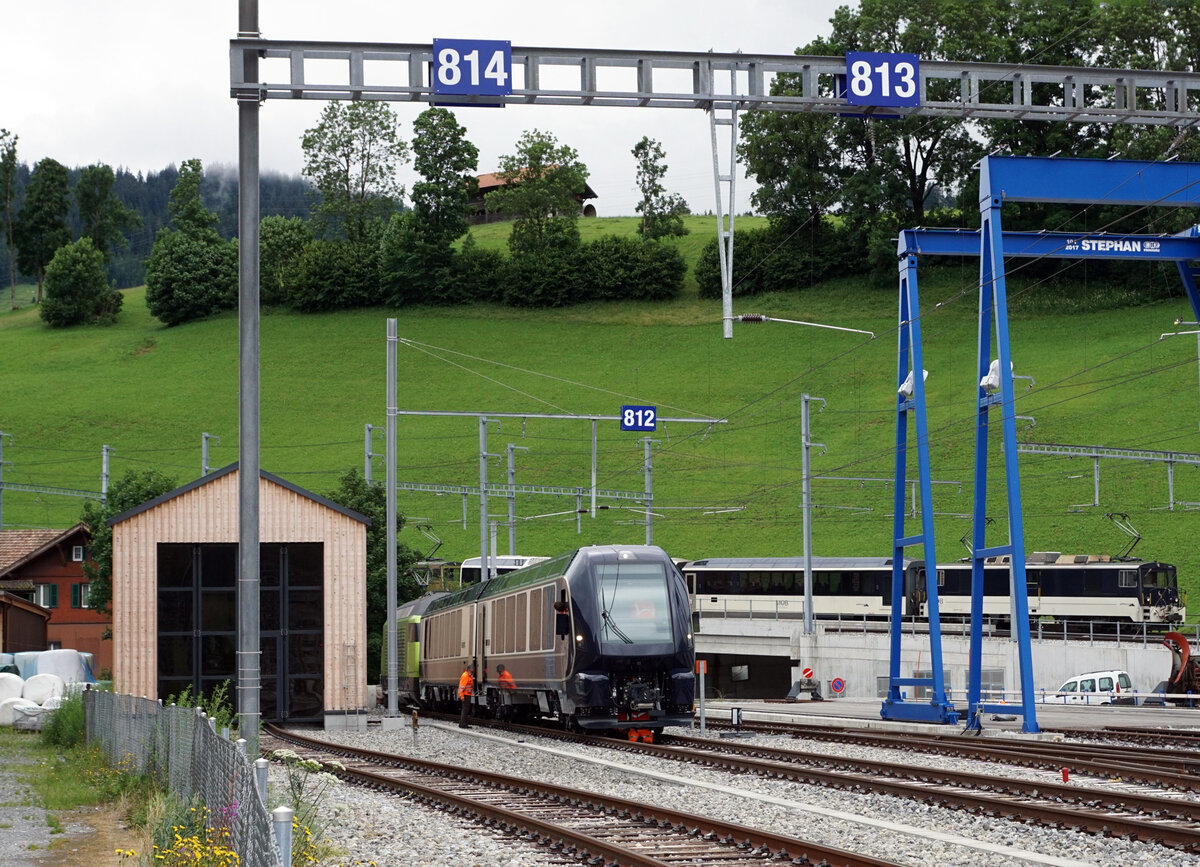 Der neuste Zug der MOB vor dem historischem Bahnhof Zweisimmen auf dem Vierschienengeleise wartend auf die nächste Testfahrt am 9. Juli 2021.