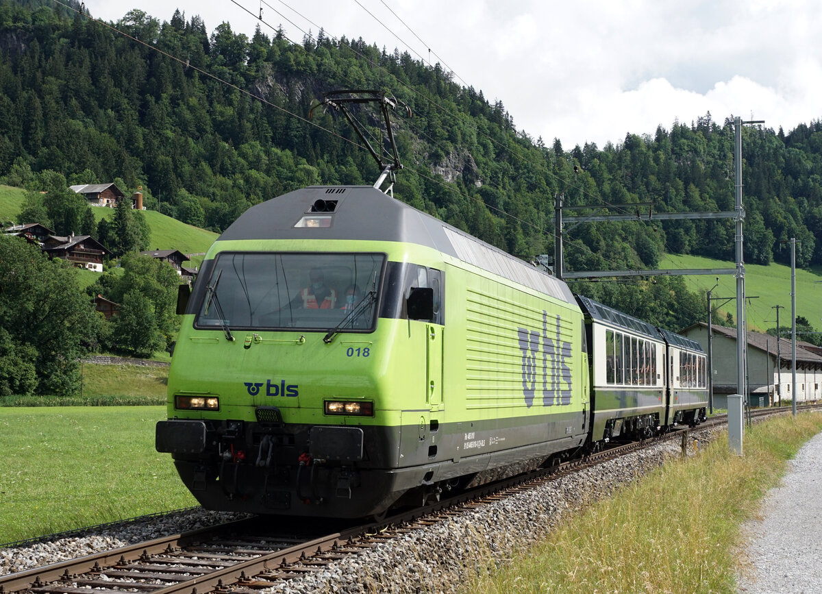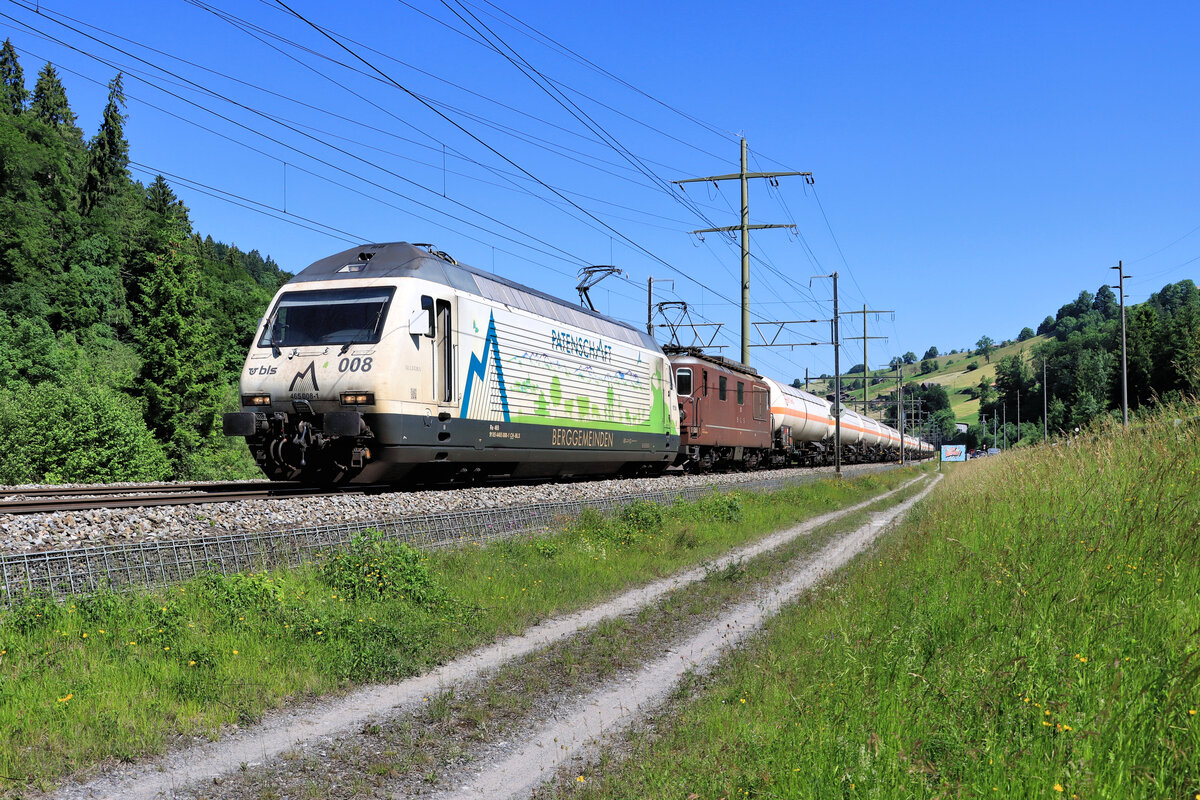 Noch ziehen einige BLS Re 465 am gleichen Strang (bzw. Güterzug) wie die braunen BLS Re 4/4. Re 465 008 und Re 425 182 in Mülenen. 14.Juni 2021