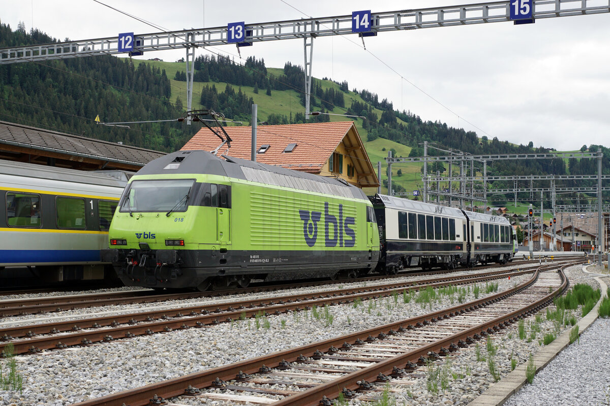 Bald sind wohl die braunen BLS Re 4/4 verschwunden. In äusserlich schlechtem Zustand wartet Lok 185 hinter der erneuerten 465 018 in Spiez darauf, gebraucht zu werden. Die erneuerten 465 sind umgebaut und verlieren ihre analogen Steuersysteme, so dass sie nicht mehr wie bisher mit den braunen Loks in Fern- und Vielfachsteuerung fahren können. 14.Juni 2021