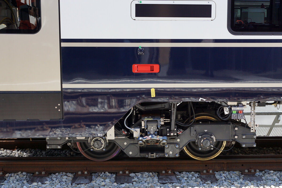 Die ersten umspurbaren Wagen des Goldenpass Express auf Testfahrt zwischen Zweisimmen und Boltigen. Eine direkte Zugverbindung zwischen Montreux, Gstaad und Interlaken wird die Attraktivität der drei touristischen Anziehungspunkte erhöhen und näher zueinander bringen. Ab dem Dezember 2022 fahren täglich vier Züge zwischen Montreux und Interlaken hin und her. Dieses Projekt realisiert die MOB zusammen mit der BLS. Züge der MOB auf schmaler und normaler Spur in Zweisimmen am 7. Juli 2021. Foto: Walter Ruetsch