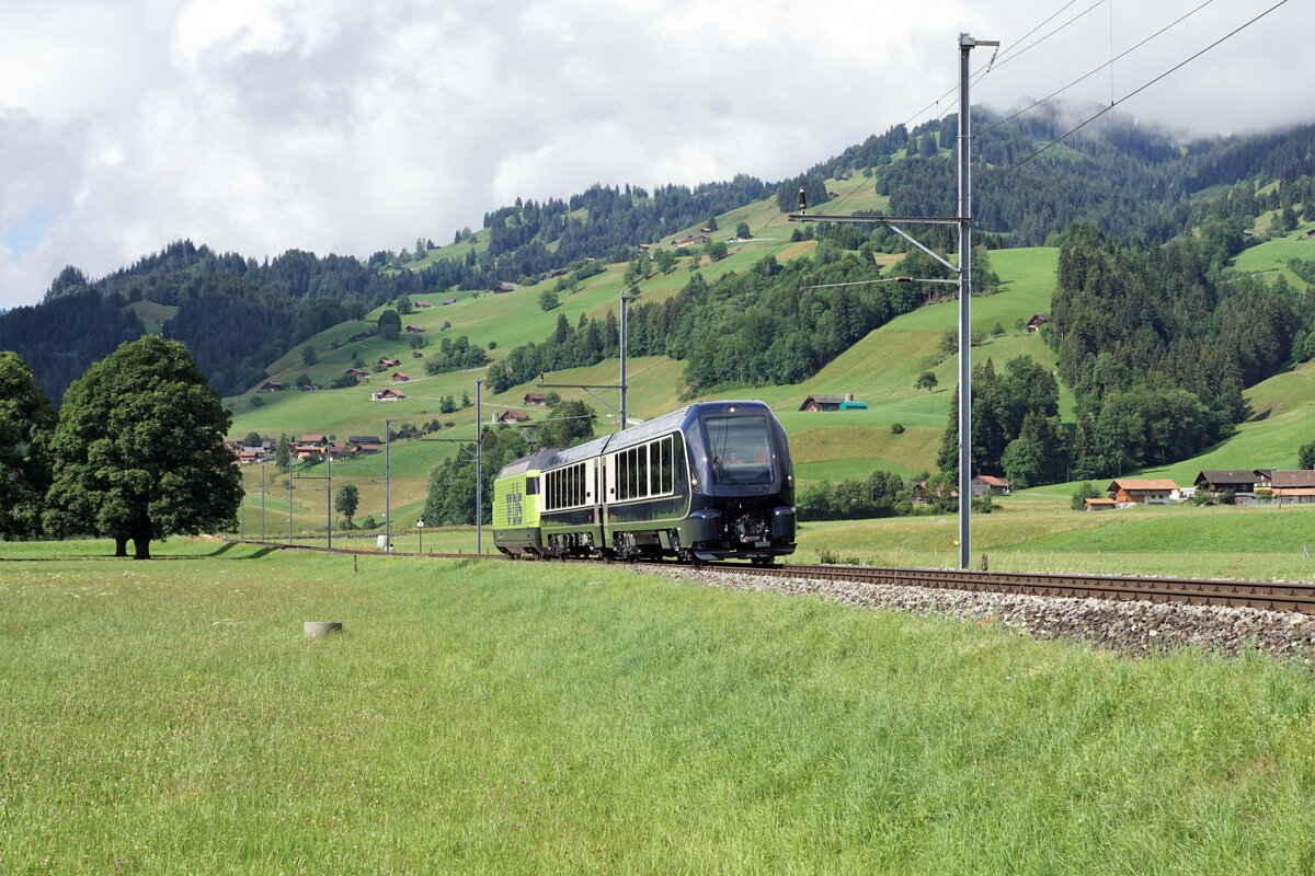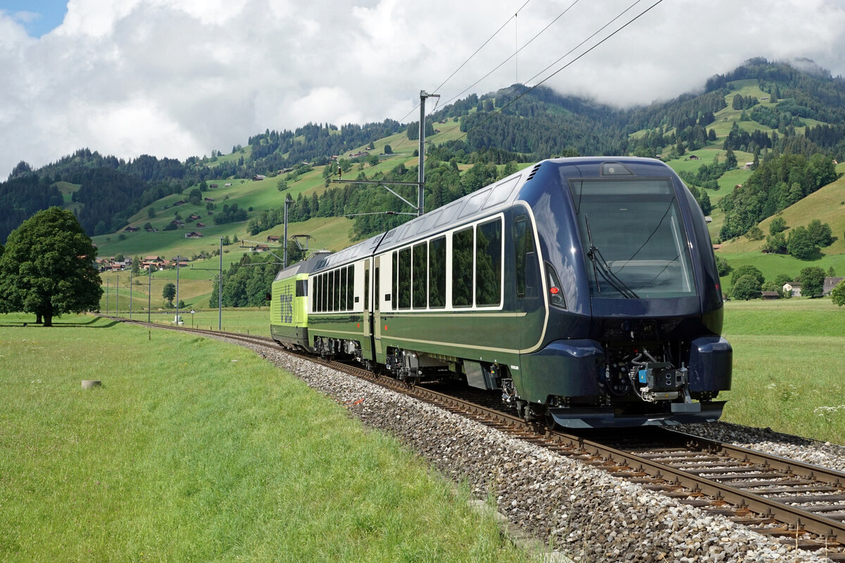 Die ersten umspurbaren Wagen des Goldenpass Express auf Testfahrt zwischen Zweisimmen und Boltigen. Eine direkte Zugverbindung zwischen Montreux, Gstaad und Interlaken wird die Attraktivität der drei touristischen Anziehungspunkte erhöhen und näher zueinander bringen. Ab dem Dezember 2022 fahren täglich vier Züge zwischen Montreux und Interlaken hin und her. Dieses Projekt realisiert die MOB zusammen mit der BLS. Erste Ausfahrt aus dem Bahnhof Zweisimmen am 7. Juli 2021. Foto: Walter Ruetsch