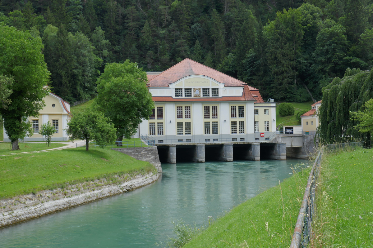 Eines der ältesten Bahnstromkraftwerke in Deutschland ist das Saalachkraftwerk in Bad Reichenhall von 1912. Es wurde für die elektrisch betriebene Strecke Freilassing - Berchtesgaden erbaut, in deren Verlauf der Hallthurmer Berg überwunden werden muß. Für das Kraftwerk wurde die Saalach zum Saalachsee aufgestaut. Das Wasser gelangt über einen Druckstollen vom Stauwerk Kibling durch den Berg zum Kraftwerk. Nachdem es die Turbinen angetrieben hat, fließt es über den im Bild sichtbaren Kraftwerkskanal zur Saalach. Die gesamte Anlage gehört heute DB Netze. Ihre Leistung beträgt 7,5 MW, ein Teil der elektrischen Energie versorgt die Stadt Bad Reichenhall. 2.Juli 2021