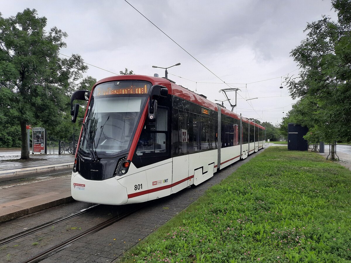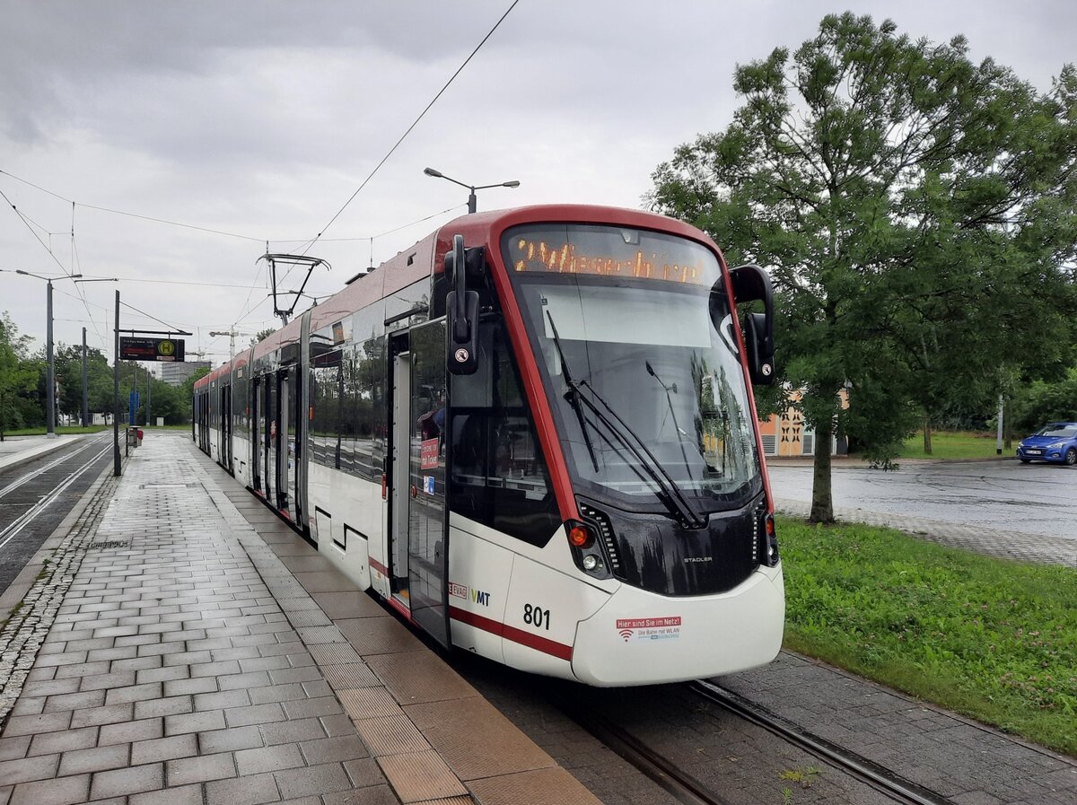 In der Nacht zum 31.03.2021 in Erfurt angekommen und nach zahlreichen Tests und einigen Problemen seit 01.07.2021 im regulären Betrieb auf der Linie 2 unterwegs - Erfurts 1. Stadler Tramlink EVAG 801. Am 09.07.2021 steht er hier an der Endhaltestelle P+R Messe. Der Tramlink verkehrt als Linie 2 zum Wiesenhügel und verbindet u.a. die beiden Standorte BUGA-Standorte mit dem Zentrum bzw. Hauptbahnhof.
