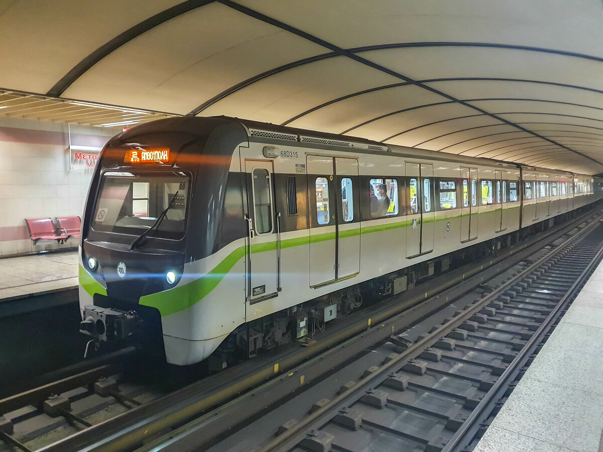 Straßenbahn Athen Zug TA10017 auf der Linie 4 nach SEF (Neo Faliro) in der Station Neo Faliro, 27.06.2021.