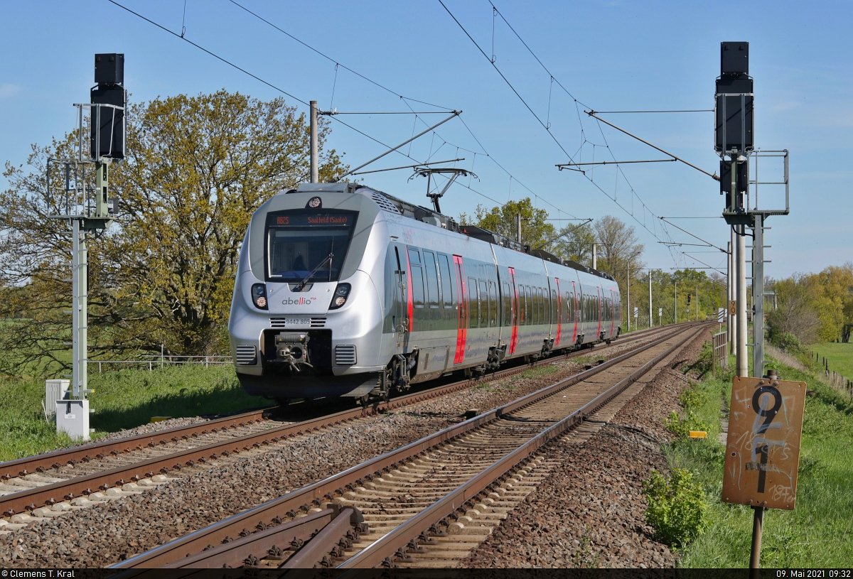 [Reupload] 9442 805 (Bombardier Talent 2) unterwegs an der Saalebrücke in Schkopau. Aufgenommen vom Saaleradweg, der über die Brücke führt (siehe Geodaten). 🧰 Abellio Rail Mitteldeutschland GmbH 🚝 RB 74662 (RB25) Halle(Saale)Hbf–Saalfeld(Saale) 🚩 Bahnstrecke Halle–Bebra (KBS 580) 🕓 9.5.2021 | 9:32 Uhr