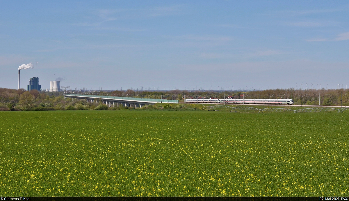 [Reupload] 411 007-8 (Tz 1107 "Pirna") und 411 575-4 (Tz 1175 "Villingen-Schwenningen") haben soeben die Saale-Elster-Talbrücke befahren und rollen bei Dieskau in mäßigem Tempo am Fotografen vorüber. Im Hintergrund erhebt sich das Kraftwerk Schkopau (Buna-Werke). Aufgenommen von der Brücke Berliner Straße. 🧰 DB Fernverkehr 🚝 ICE 1600 (Linie 28) München Hbf–Hamburg-Altona / ICE 1710 "Arkona" (Linie 28) München Hbf–Ostseebad Binz 🚩 Neubaustrecke Erfurt–Leipzig/Halle (Fv1) 🕓 9.5.2021 | 11:55 Uhr