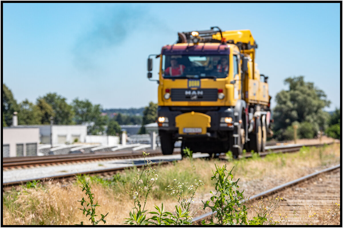 Unkraut ,... Schädlich für den Fahrweg , darum muss es bekämpft werde. Dazu kommt dieser 2Wege LKW zum Einsatz um am 6.Juli 2021die Anschluss und Abstellgleise der GKB zu behandeln.