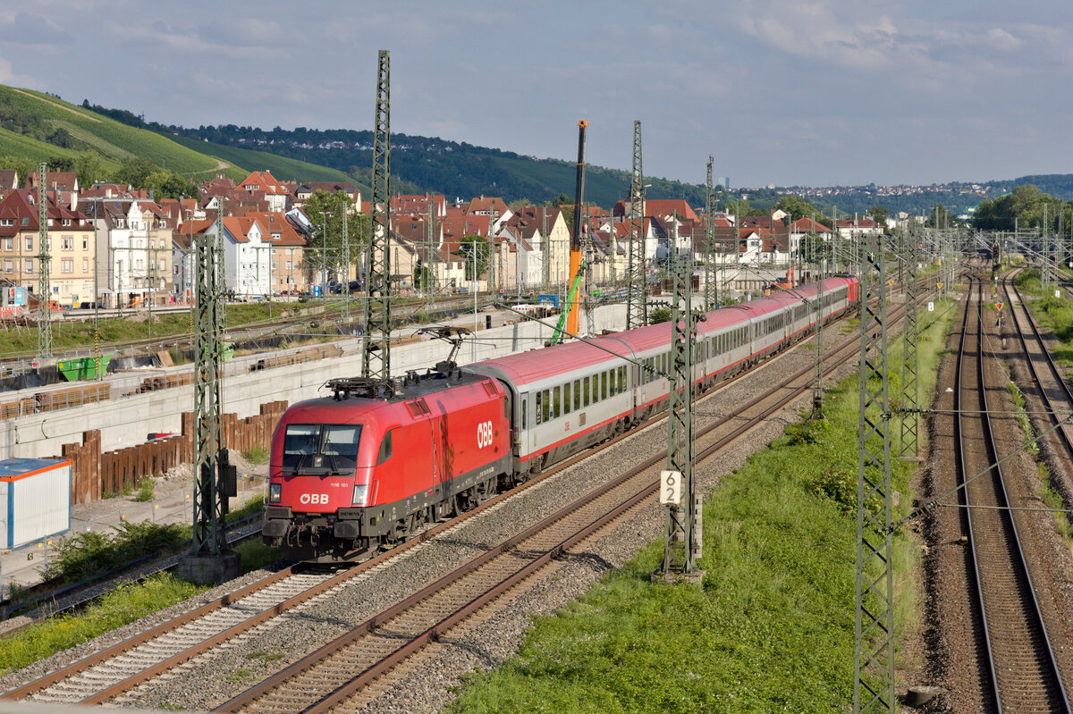 1116 181 mit EC 112 Klagenfurt-Frankfurt am 02.07.2021 am Eszetsteg in Stuttgart. Geschoben wurde die Garnitur von einer weiteren 1X16.