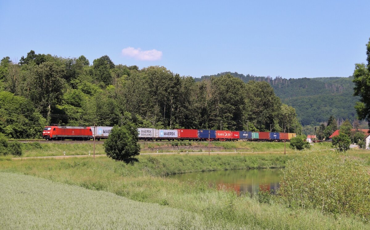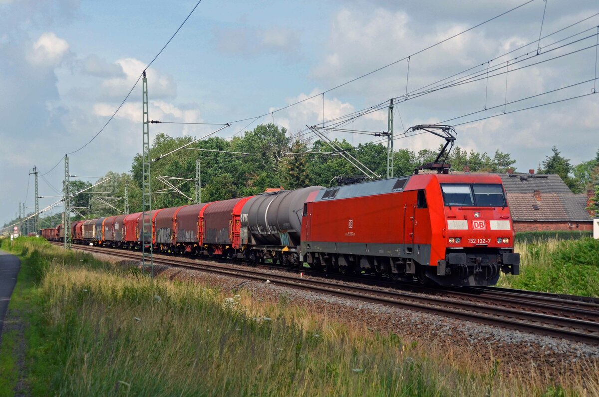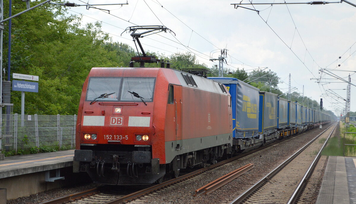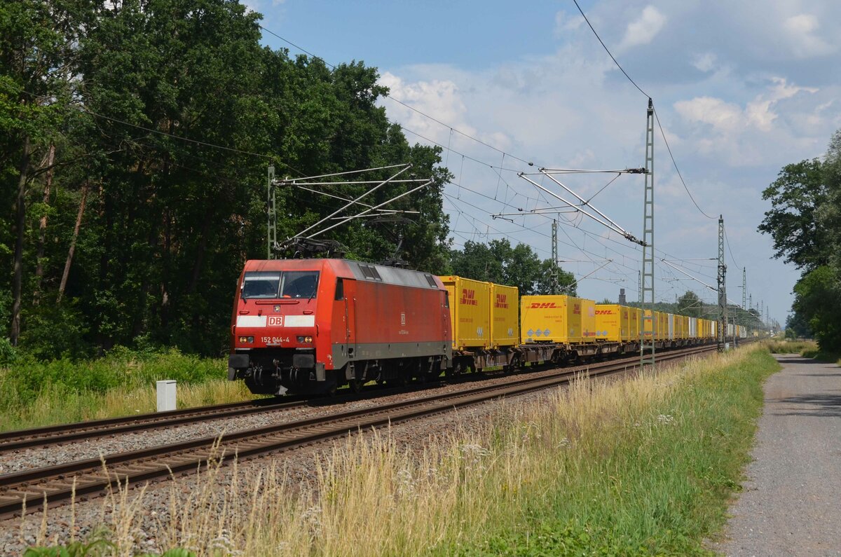Mit einem DHL-Containerzug aus Großbeeren rollt 152 044 am 04.07.21 durch Radis Richtung Bitterfeld.