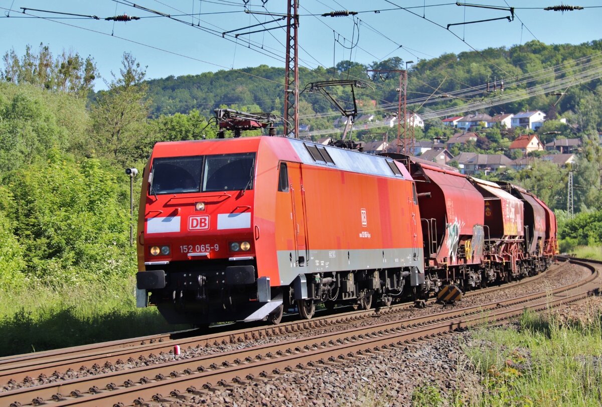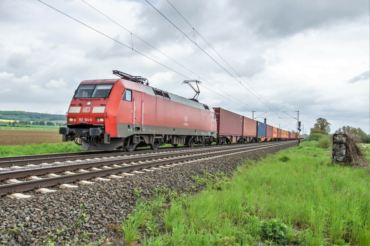152 104-6 ist mit seinen Containerzug bei Friedland am 18.05.2021 in Richtung Süden unterwegs.