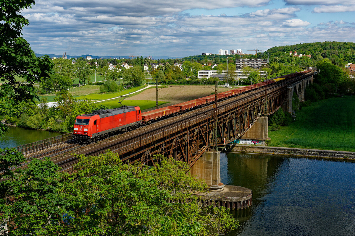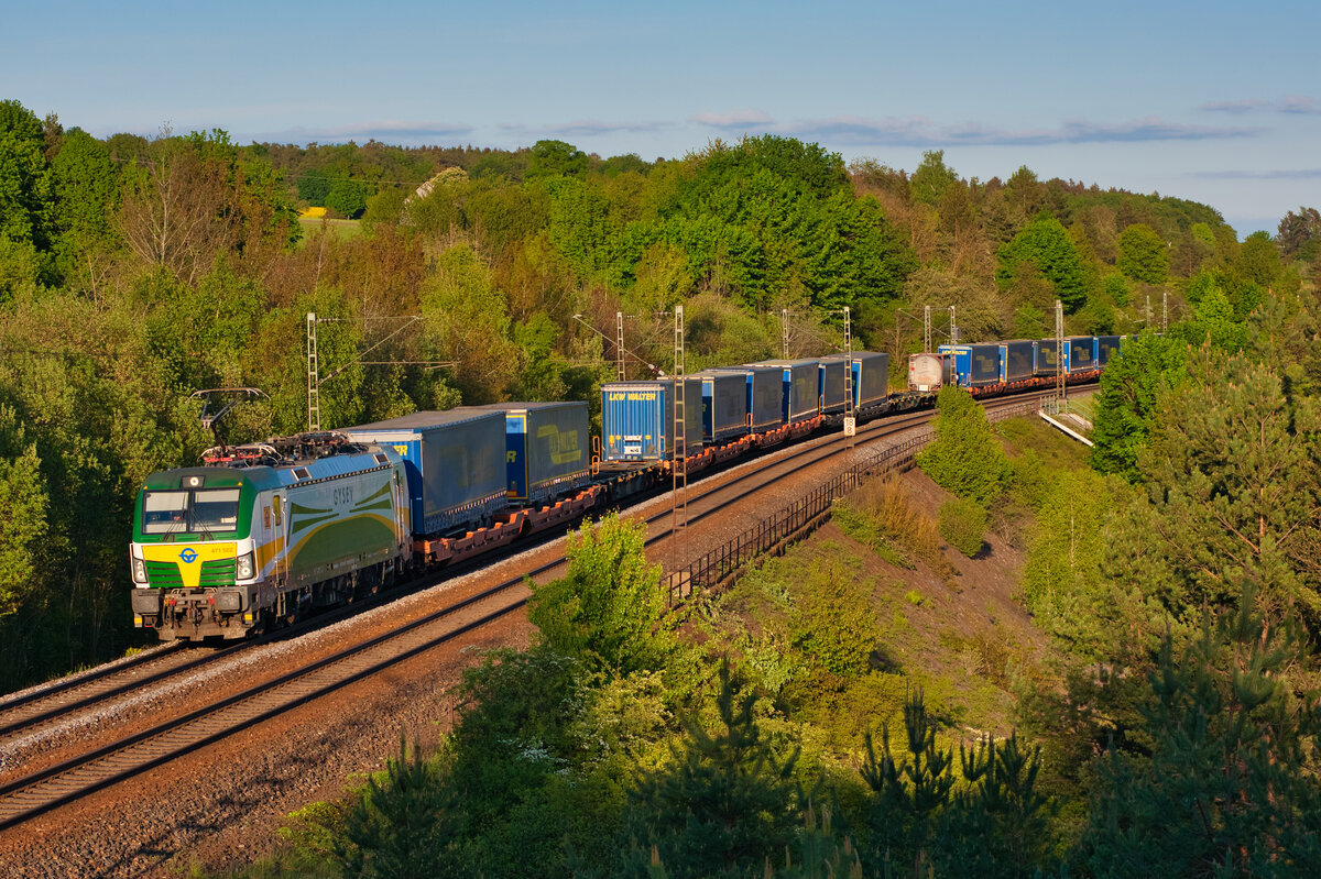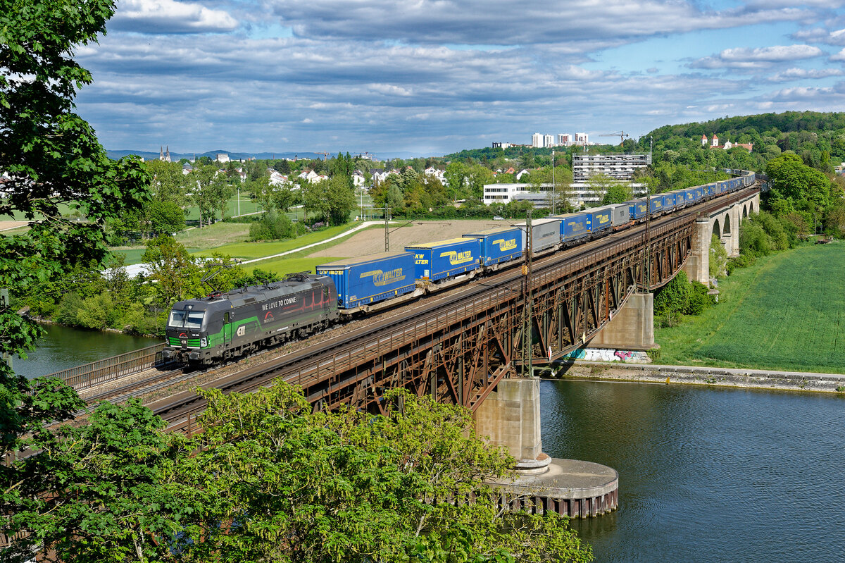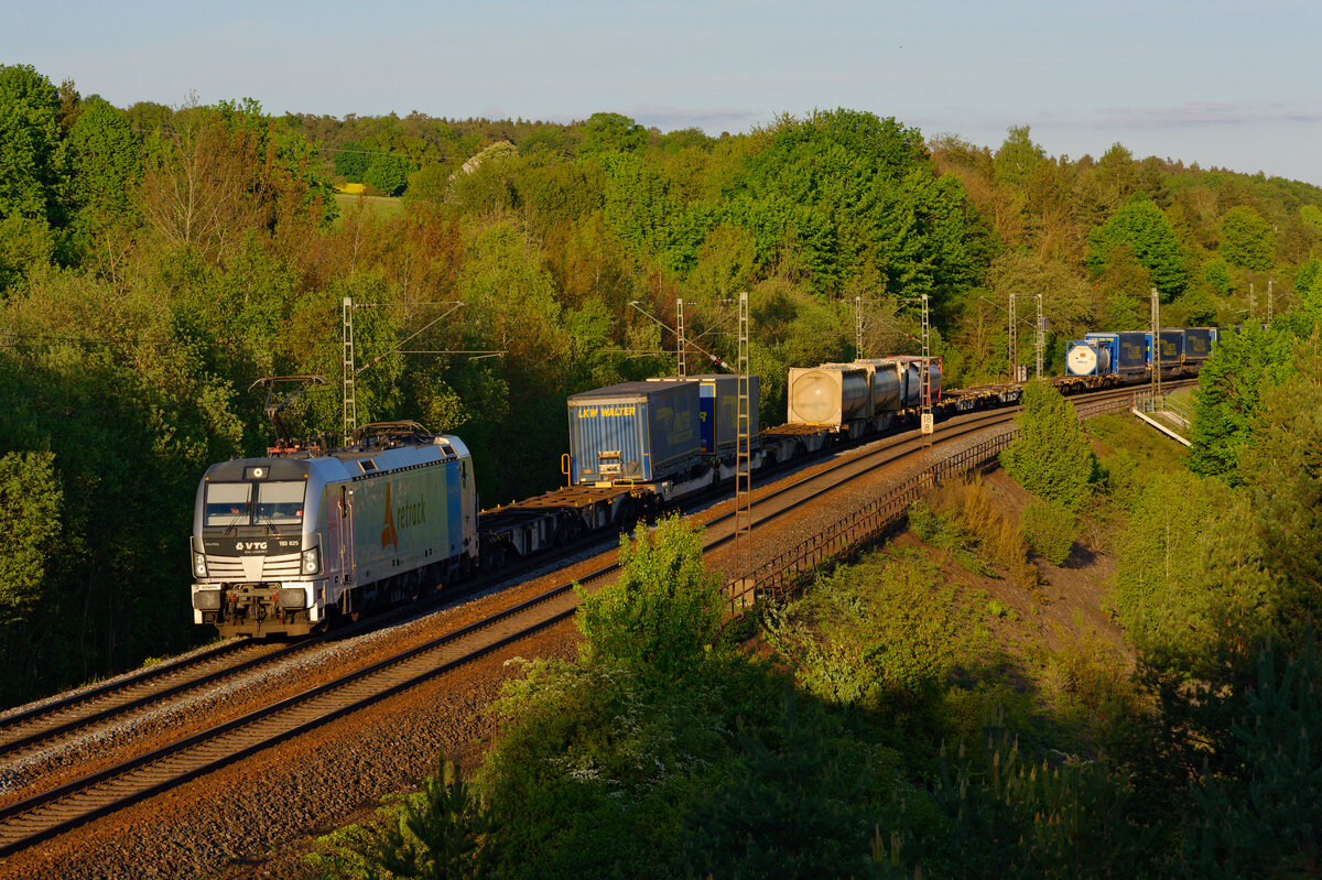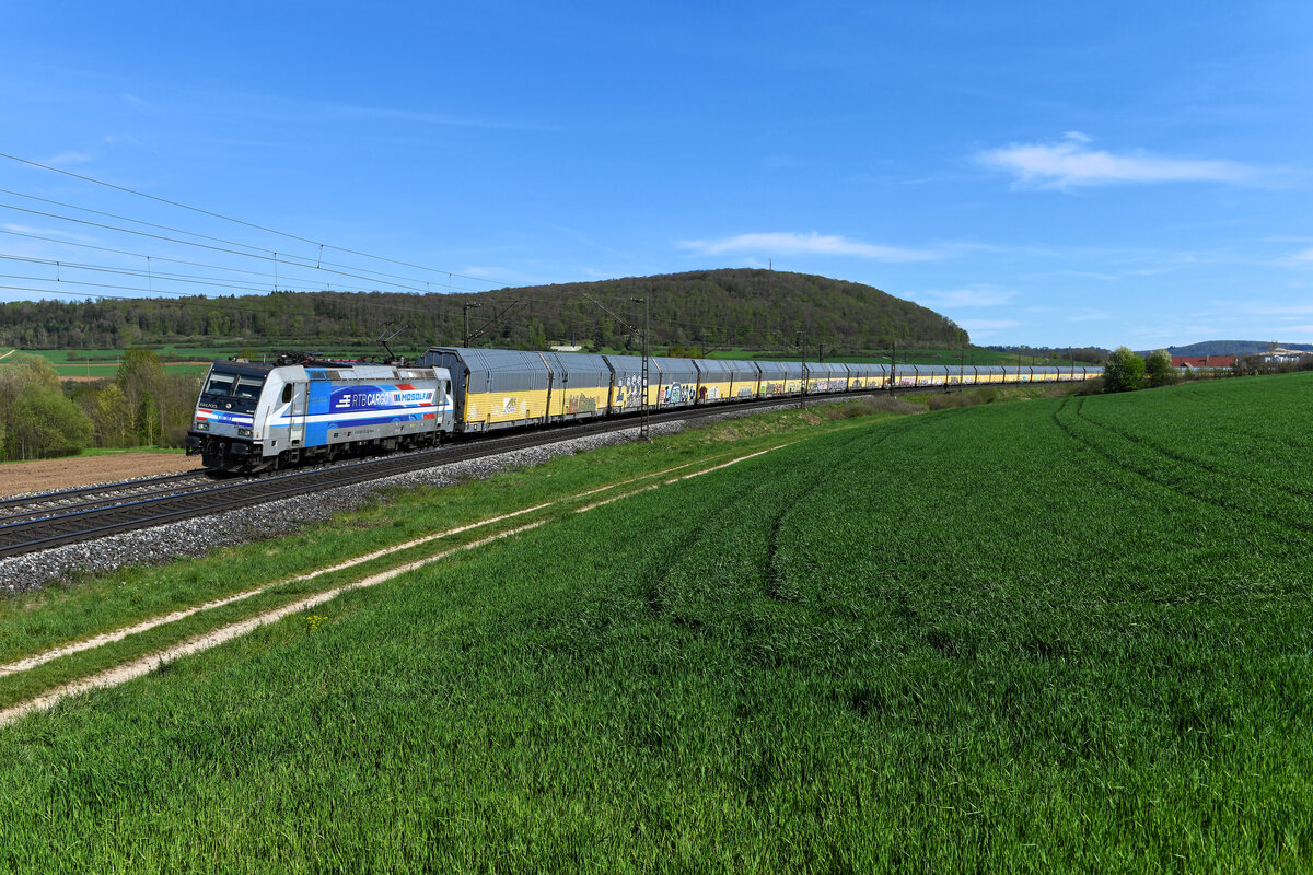 Die von Railpool angemietete 185 672 der Rurtalbahn Cargo trägt auf den Seitenwänden ein Motiv, das auf die Zusammenarbeit mit dem Autologistik-Unternehmen Mosolf hinweist. Am 09. Mai 2021 konnte die Maschine abseits ihrer üblichen Laufwege bei Treuchtlingen beobachtet werden. Sie führte an diesem Tage den umgeleiteten Neuwagentransport DGS 48942 von Graz Ost nach Zeebrugge Vorming.