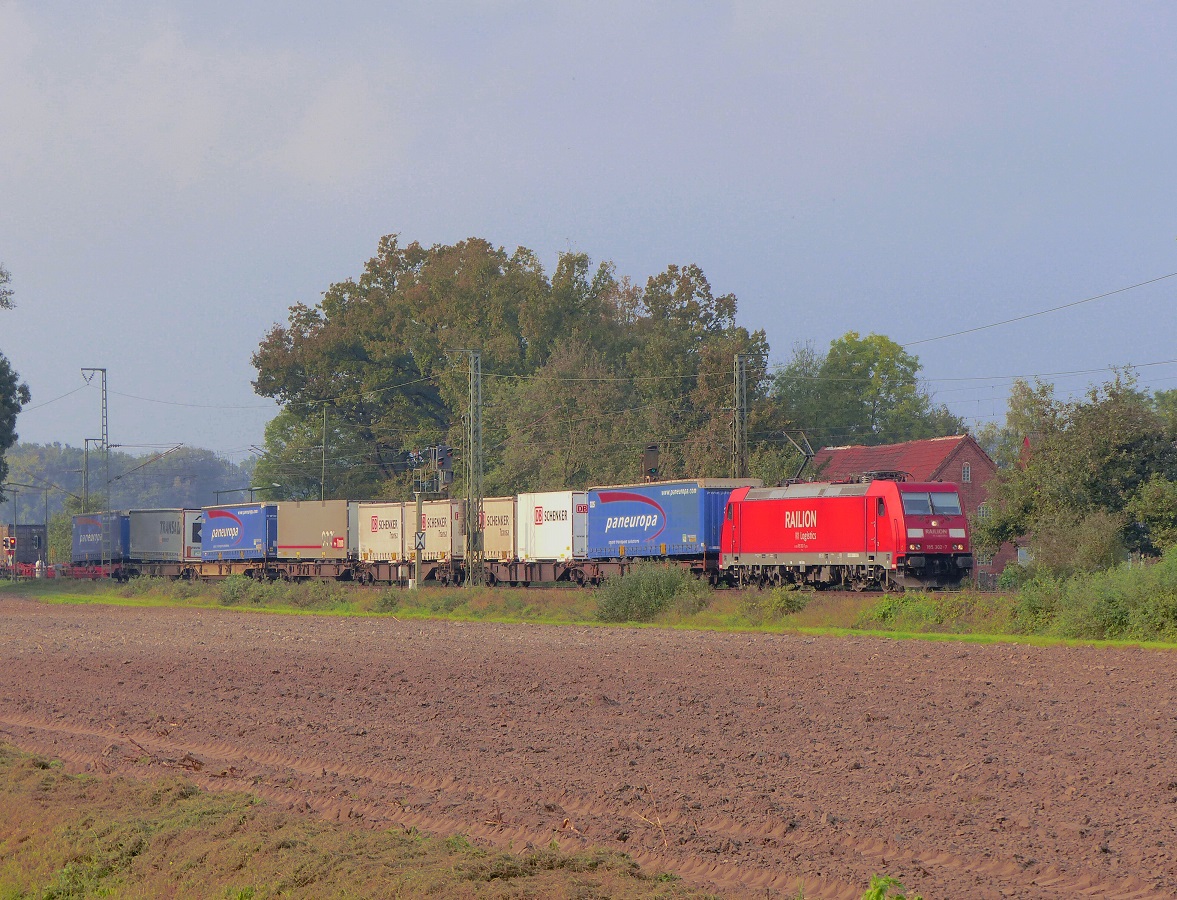 185 302 "flüchtet" mit einem KLV-Zug von Dörpen bei Salzbergen (ehem. Bk Deves) vor einem Gewitter, 02.10.14