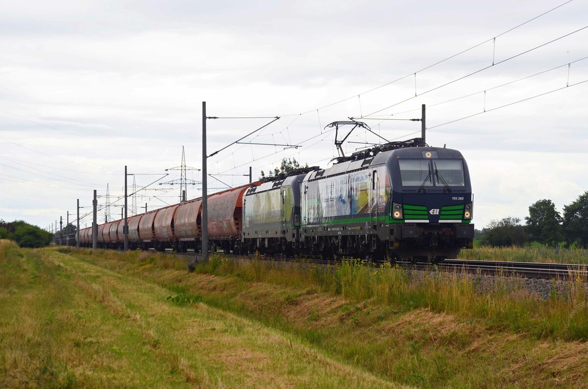 193 263 der LTE schleppte am 30.06.21 einen Silozug durch Braschwitz Richtung Magdeburg. Hinter der Zuglok läuft 193 729 als Wagenlok mit.