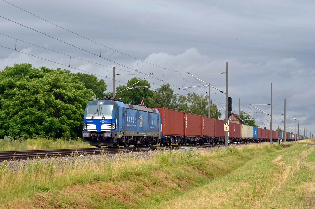 186 445 der railpool führte am 30.06.21 für ihren Mieter Lineas einen gemischten Güterzug, welcher fast nur aus Containern bestand, durch Braschwitz Richtung Halle(S).