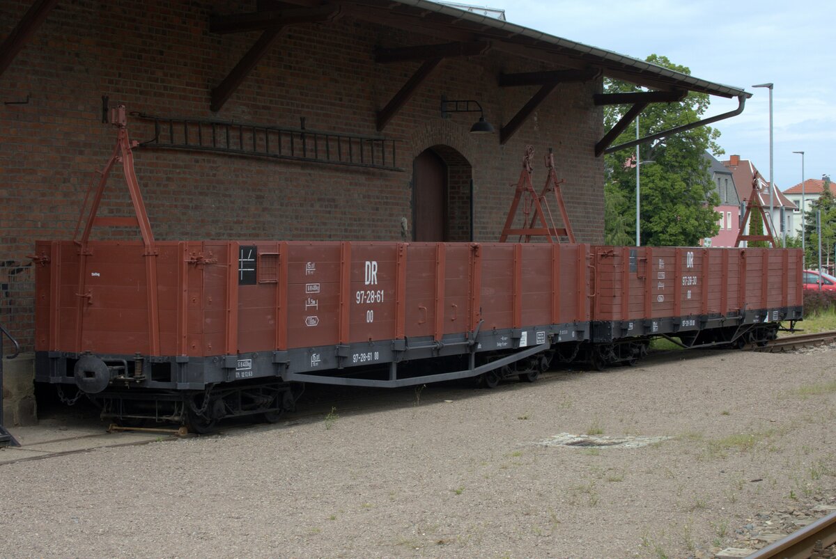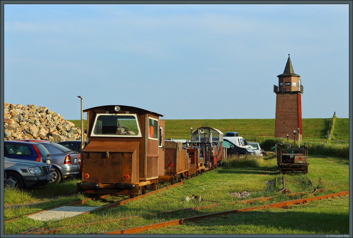 Am alten Leuchtturm von Dagebüll befindet sich der landseitige Endpunkt der Lorenbahn zu den Halligen Oland und Langeneß. Hier können die Halligbewohner auf den Pkw umsteigen. Mehrere offene und geschlossene Loren sonnen sich am 28.06.2021 im Abendlicht.