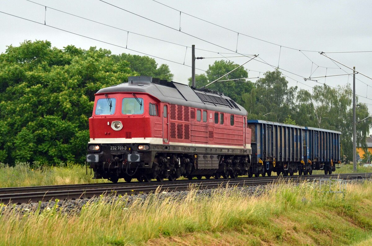 232 701 der LEG rollte am 30.06.21 mit zwei Hochbordwagen durch Braschwitz Richtung Halle(S).