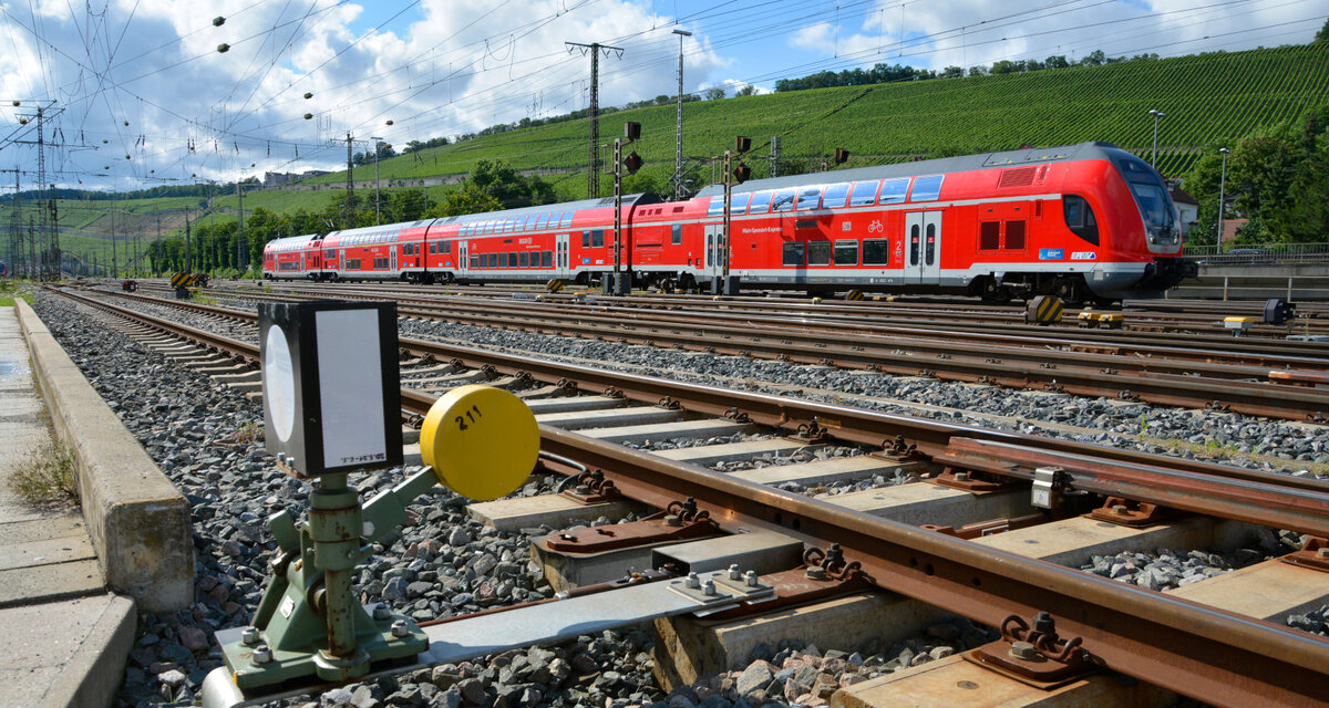 445 045 des Main-Spessart-Express von Frankfurt/Main kommend erreicht seinen Zielbahnhof Würzburg. Aufgenommen außerhalb des Gefahrenbereichs von einem Weg aus direkt neben den Gleisen. 14. Juli 2021