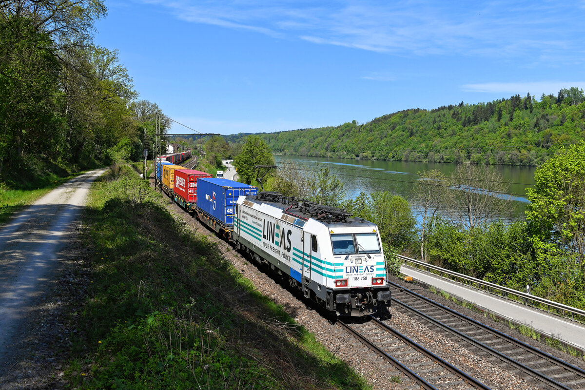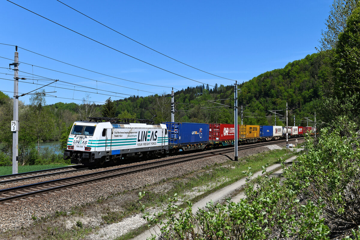 Am 10. Mai 2021 bespannte die an Lineas vermietete 186 258 von Railpool den DGS 40679 von Genk nach Curtici. Den farbenfroh beladenen KLV-Zug konnte ich in der Nähe des ehemaligen Bahnhofs von Seestetten fotografieren. Hier verläuft die Strecke direkt an der Donau entlang.