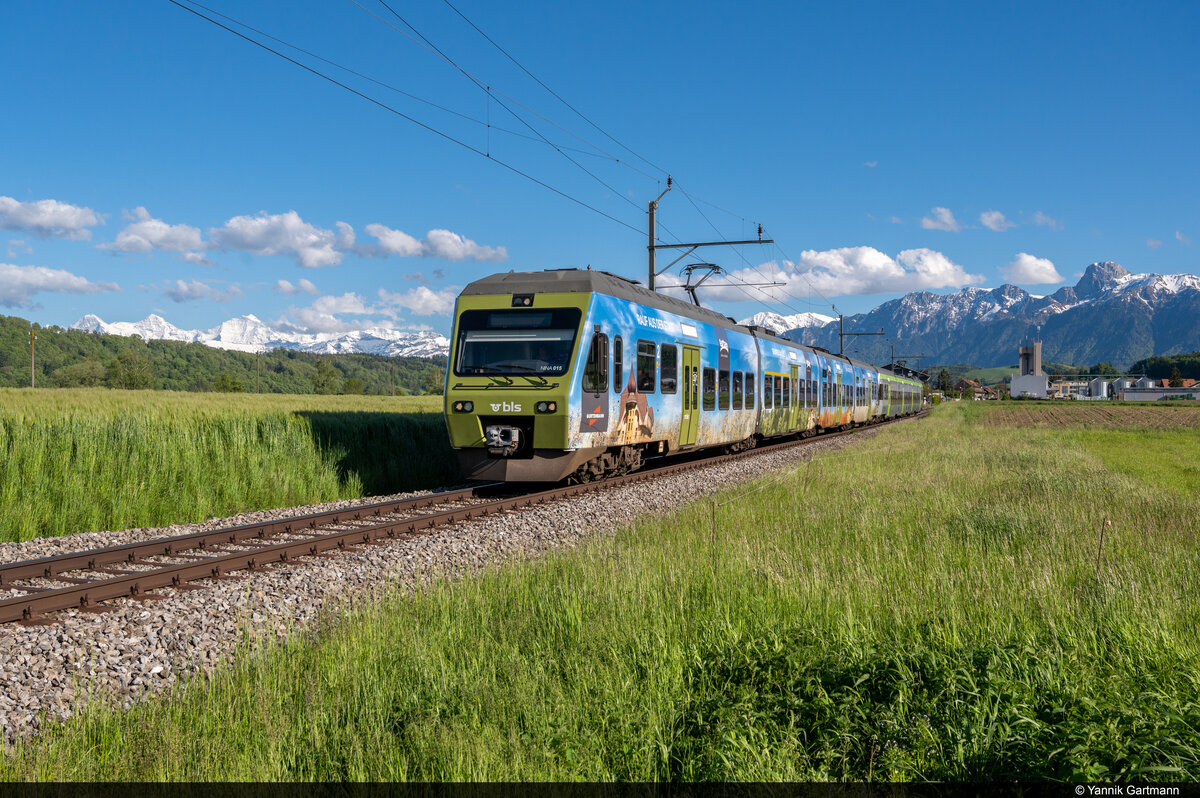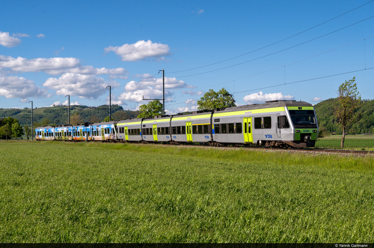 Am 25.05.2021 ist BLS RBDe 565 728 unterwegs als S4 15462 von Langnau i.E. nach Thun und konnte hier kurz vor dem Überqueren der Gürbebrücke bei Burgistein aufgenommen werden.