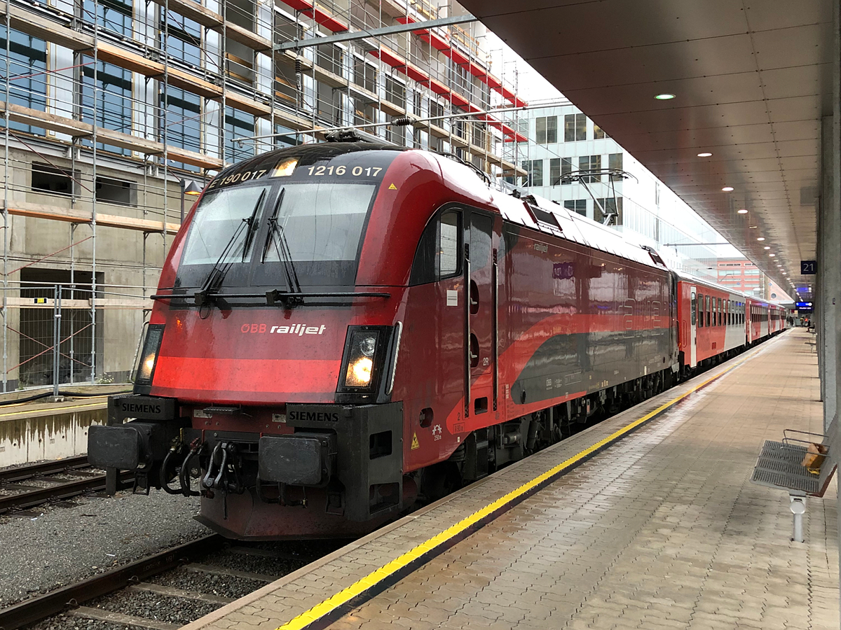 1116 203-1 am Zugschluss des RJX 169 nach Wien Hbf. Aufgenommen am Abend des 14.09.2019 in St. Anton am Arlberg