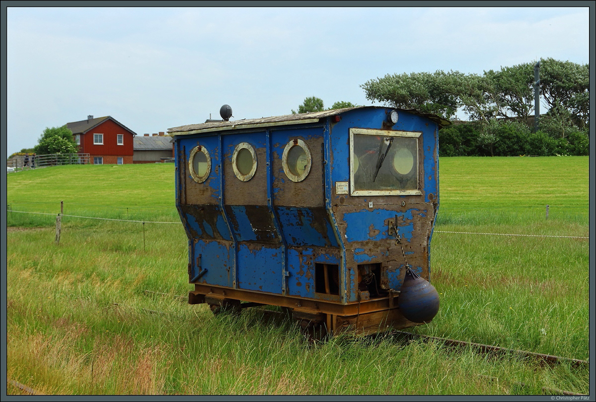 Auf Oland steht am 29.06.2021 die blaue Lore 30 auf dem Ausweichgleis. Die Halligbewohner nutzen die selbstgebauten Unikate für die Fahrt zum Festland.