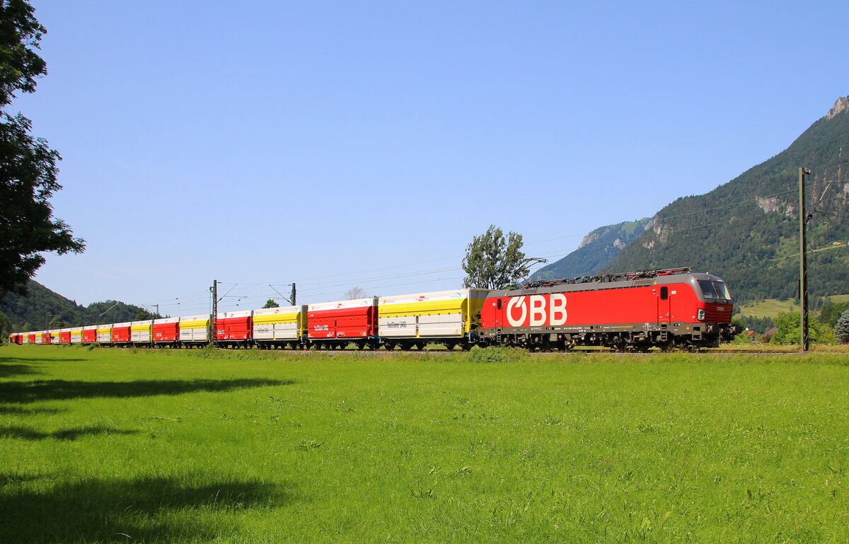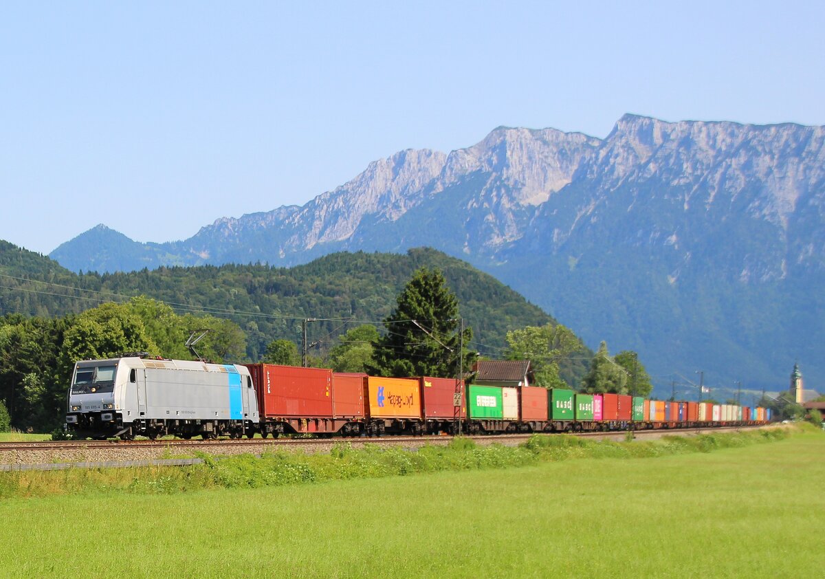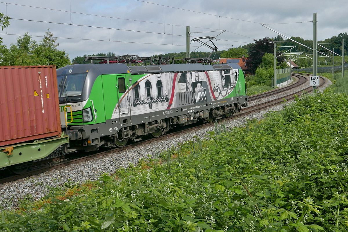 Aus Richtung Lindau-Reutin kommend zieht 193 746-5 am 07.06.2021 bei Bodolz einen Containerzug das Allgäu hinauf in Richtung Hergatz/Kißlegg