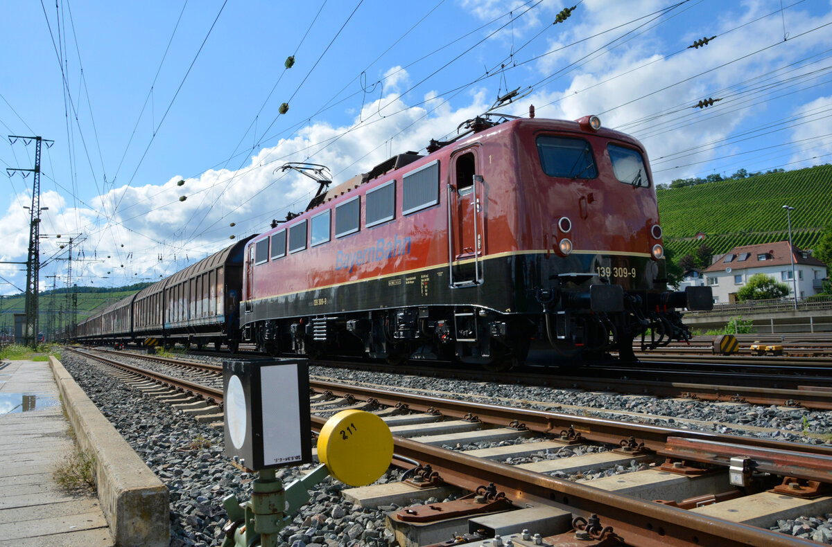 BayernBahn 139 309-9 rollt mit dem Henkelzug langsam in Würzburg Hbf ein. Aufgenommen außerhalb des Gefahrenbereichs von einem Weg aus direkt neben den Gleisen. 14.07.2021.