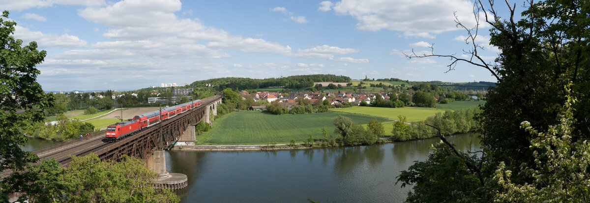 Blick in das Donautal bei Mariaort, RE (Nürnberg Hbf - München Hbf) überquert gerade die Prüfeninger Eisenbahnbrücke kurz vor Regensburg, 06.05.2020