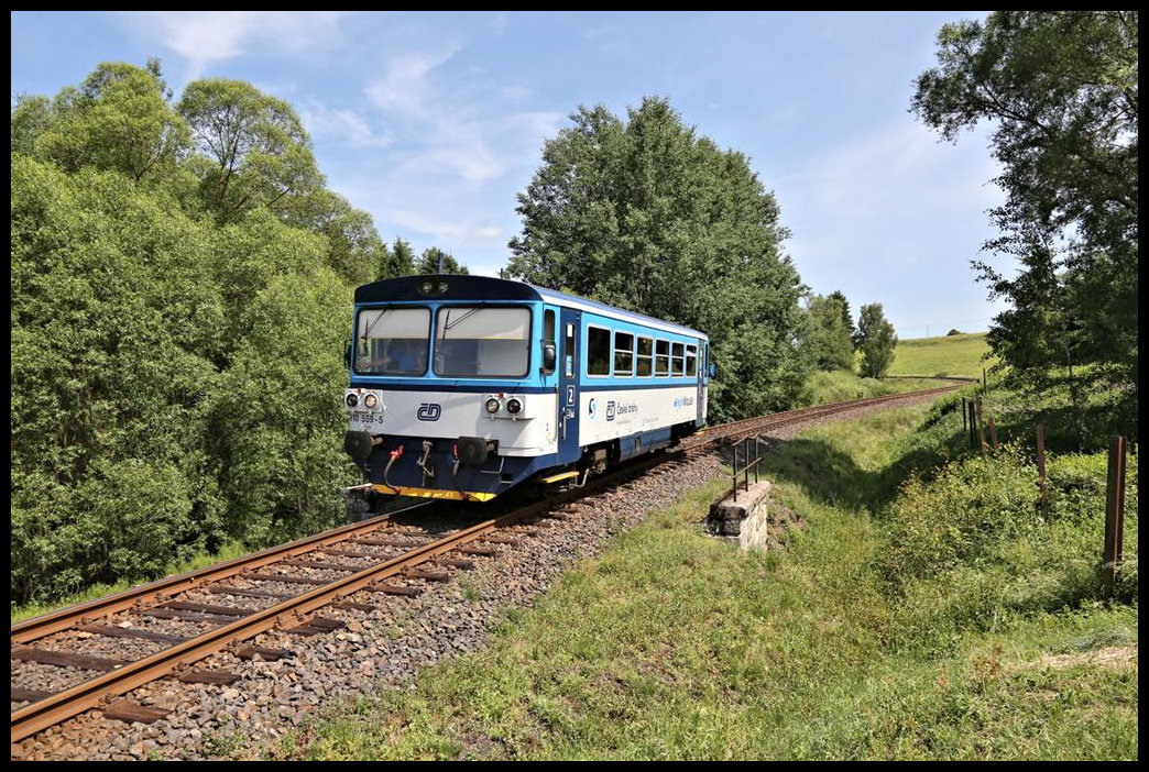 In der schönen Landschaft bei Otrocin ist hier der CD 810559-5 als Zug 16708 am 28.6.2021 um 14.57 Uhr nach Karlsbad unterwegs.
